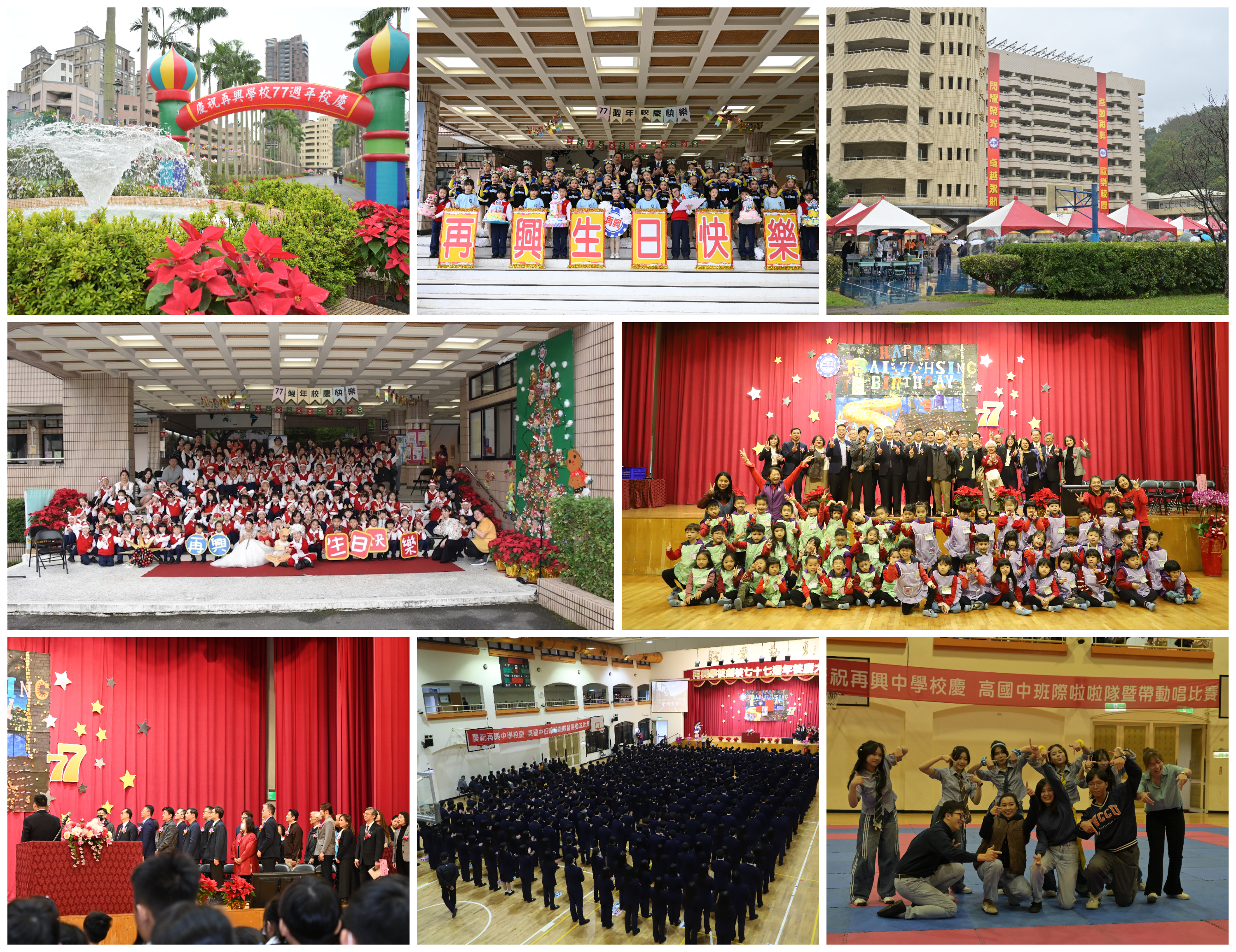 12月25日是本校創校77週年的校慶,今年慶祝大會於25日(四)舉辦,開放家長及校友入校。冬日陰雨微寒的清晨,天空飄著細雨,卻掩不住洋溢在偌大校園裡的歡騰氣息;風雨並未澆熄大家的熱情,反倒讓這份團聚的溫暖更顯珍貴。慶祝大會於中學知新樓 B3 盛大舉行,與此同時,校園各處亦熱鬧非凡,中學部園遊會的叫賣聲此起彼落,小學與幼兒園的趣味闖關活動更是充滿了歡笑聲。到了下午,小學部活動中心內暖意融融,「校慶藝文表演」在萬眾期待中熱鬧登場;表演結束後,場景轉移至各班教室,進行溫馨的「才藝表演暨同學會」。在同樂會的輕鬆氛圍中,凝聚成再興大家庭最獨特的生日回憶。中學部則是全場引頸企盼的重頭戲——國中帶動唱及高中啦啦隊比賽壓軸登場,學子們用青春的汗水將現場氣氛推向最高潮。