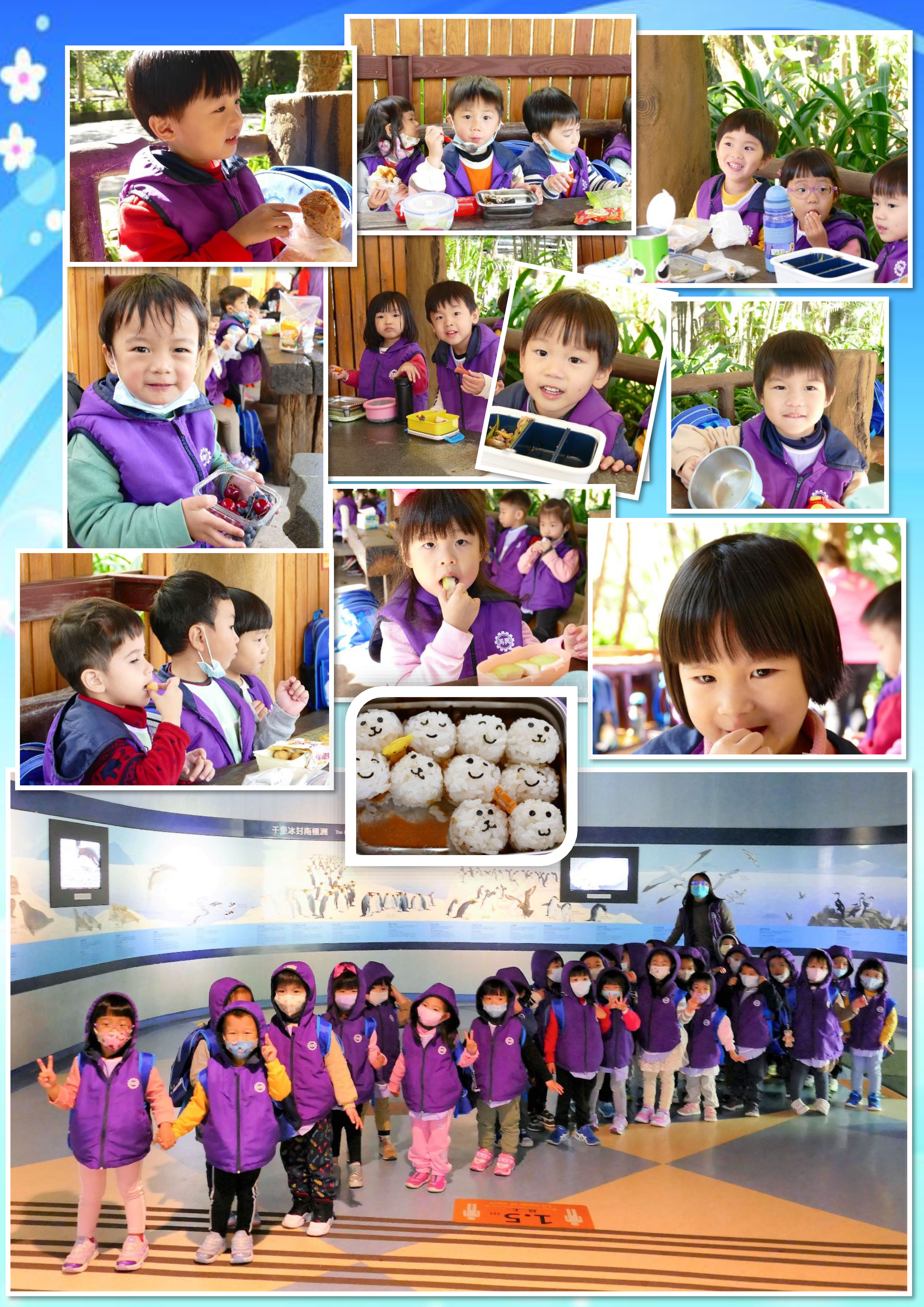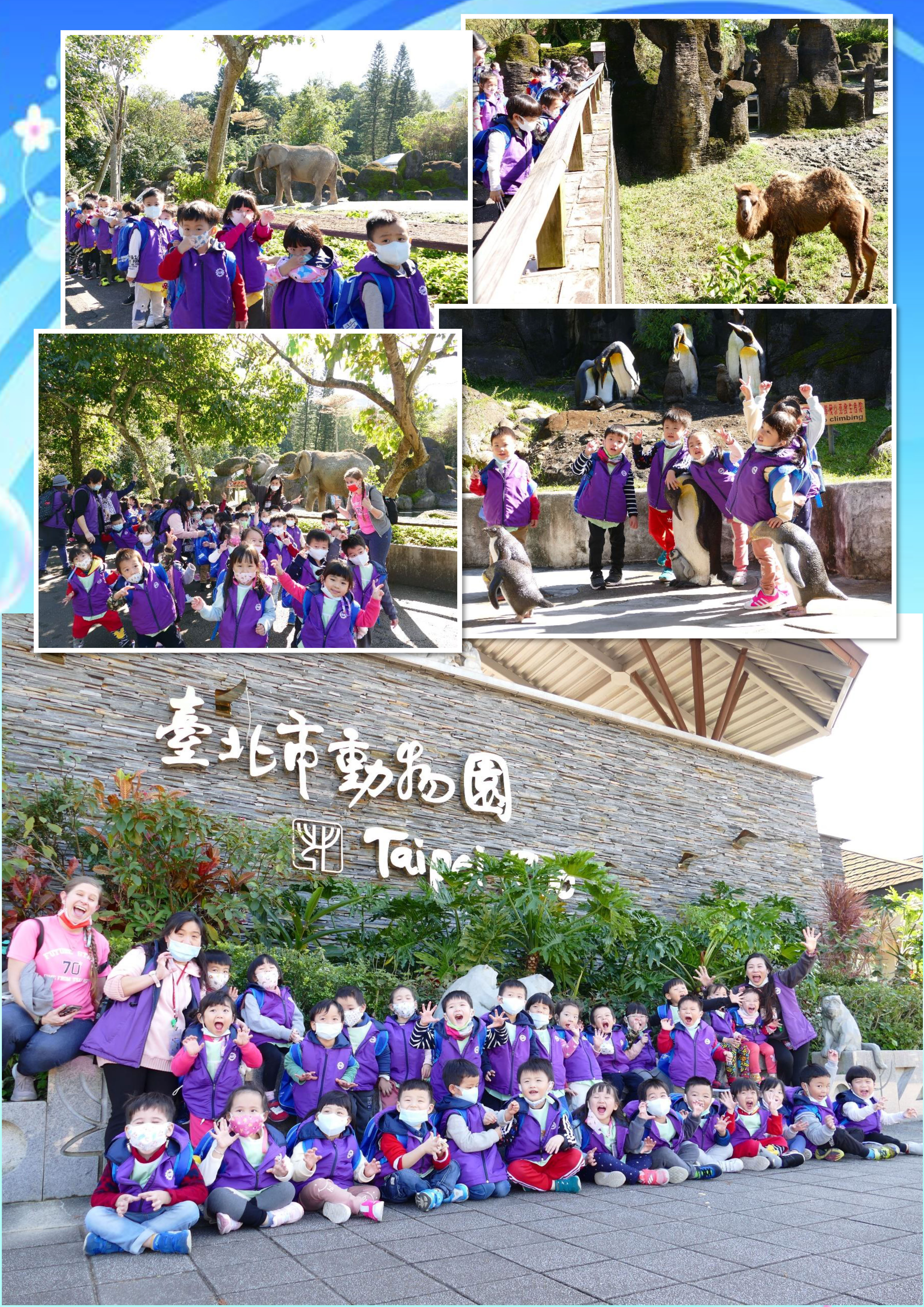 1月14日(四)小班組的寶貝前往「臺北市立動物園」拜訪可愛的動物朋友,小寶貝們搭乘遊園列車到溫帶動物區的企鵝館,觀賞「國王企鵝」家族們可愛的互動,也到非洲動物區欣賞非洲象長長鼻子捲草進食的逗趣模樣。 中午品嚐媽咪準備的豐盛午餐是孩子們期待的重要「行程」,餐後寶貝們帶著媽咪滿滿的愛心結束歡樂有趣的動物園之旅!