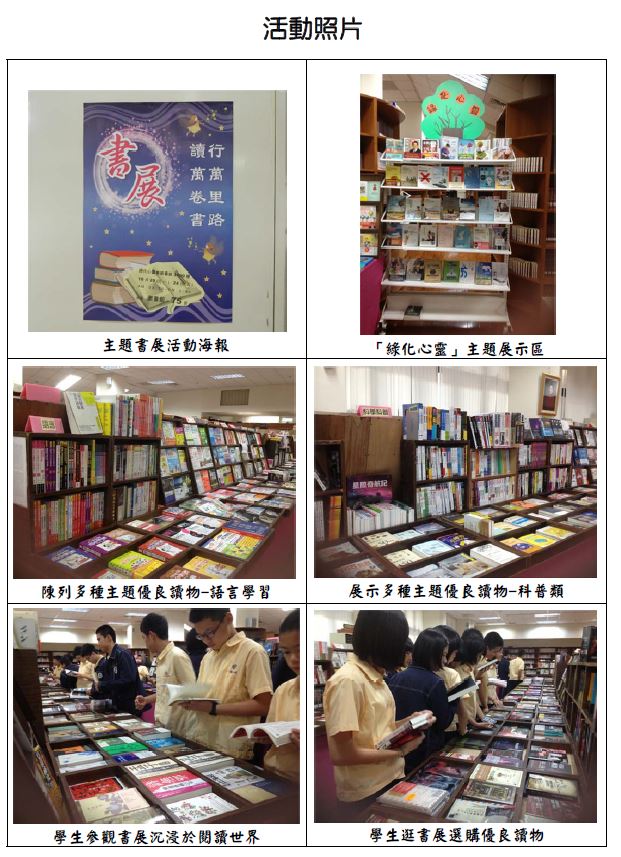 圖書館為推廣課外閱讀,透過校園主題書展讓學生有機會接觸各主題優良課外讀物,故於10月20日至10月24日於知新樓B1圖書館辦理主題書展,邀請全校師生共襄盛舉。為配合學生上課時間,參展時間為每日早上8點45分至下午6點整,本次參展登記班級計有29班,除課程時間由老師帶領參展之外,學生亦可利用下課時間、中午和放學後5點至6點時段至圖書館自由瀏覽。本次書展主題為「綠化心靈 心靈有氧」,主要展示生命教育和心靈勵志暢銷相關書籍,如有來自天堂的第一通電話、每一天練習照顧自己、蔡康永的說話之道2、TEDxTaipei 18分鐘 淬煉的人生智慧等。同時為豐富書展內容及使學生廣泛攝取多種新知,亦展示各式主題新書,如有奇幻推理、西洋文學、休閒生活、觀光旅遊、翻譯文學、歷史探索、語言學習、財經企管、設計美術、藝術美術、科學科普等多樣性展示。