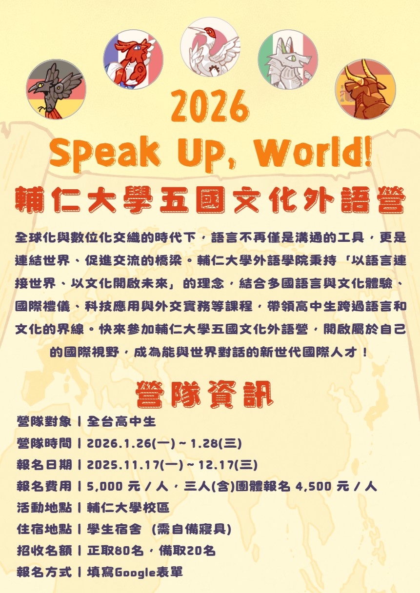 【說明】 一、活動緣起: 本校外語學院秉持「以語言連接世界、以文化開啟未來」之辦學理念,結合多國語言、文化體驗與國際禮儀等課程,期望透過營隊形式激發高中生對外語學習的興趣,引導學員理解不同文化背景下之溝通方式與交流精神。本營隊並融入科技創新與國際溝通之學習元素,協助學員建立與世界對話之橋梁,使學生在探索語言與文化的過程中開拓國際視野,厚植未來競爭力。 二、活動宗旨: 在全球化與數位化快速發展的時代,語言已超越溝通工具,成為促進理解、連結世界的重要媒介。本營隊以「Speak Up,World! 外語營」為主題,旨在引導高中生接觸多國語言文化,體驗國際交流精神。透過語言、文化與科技創新之融合課程,協助學生建立面向世界之格局,並提升其跨文化敏感度與國際視野。 三、營隊資訊如下: (一)營隊對象:全台高中生。 (二)營隊時間:2026年1月26日(星期一)至1月28日(星期三),三天兩夜。 (三)報名期間:2025年11月17日(星期一)至12月17日(星期三)。 (四)活動地點:輔仁大學校區。 (五)住宿地點:本校學生宿舍(需自備寢具)。 (六)報名方式:掃描海報上QR code報名表單。 (七)招收名額:正取80名,備取20名。 (八)費用:1. 個人報名:每人新台幣5,000元。 2. 三人(含以上)團體報名:每人新台幣4,500元。 四、營隊目標: 本營隊著重能力養成,期望學生於參與後能具備以下核心能力: (一)語言基礎運用能力:掌握日、德、義、法、西五國基礎會話表達技巧。 (二)跨文化理解能力:辨識不同文化之價值觀、禮儀與溝通方式。 (三)外交與國際議題思辨能力:透過外交實務案例建立分析能力與表達策略。 (四)科技整合與創新學習能力:運用數位工具提升語言學習與國際交流效率。 (五)團隊協作與自信表達能力:於多國文化情境活動中養成協作精神與公開表達之自信。 五、檢附活動簡章及海報電子檔,惠請協助公告並轉知貴校學生踴躍參與。(如附件一之照片、附件二之連結所示。) 六、聯絡窗口如下: (一)輔仁大學義文三 吕稚亭 0909030562 (二)輔仁大學日文二 林毅鎧 0905402980 (三)輔仁大學西文二 王怡凡 0979722750 七、補充資料:詳如附件一、附件二。 輔仁大學「2026 Speak Up, World! 五國文化外語營」