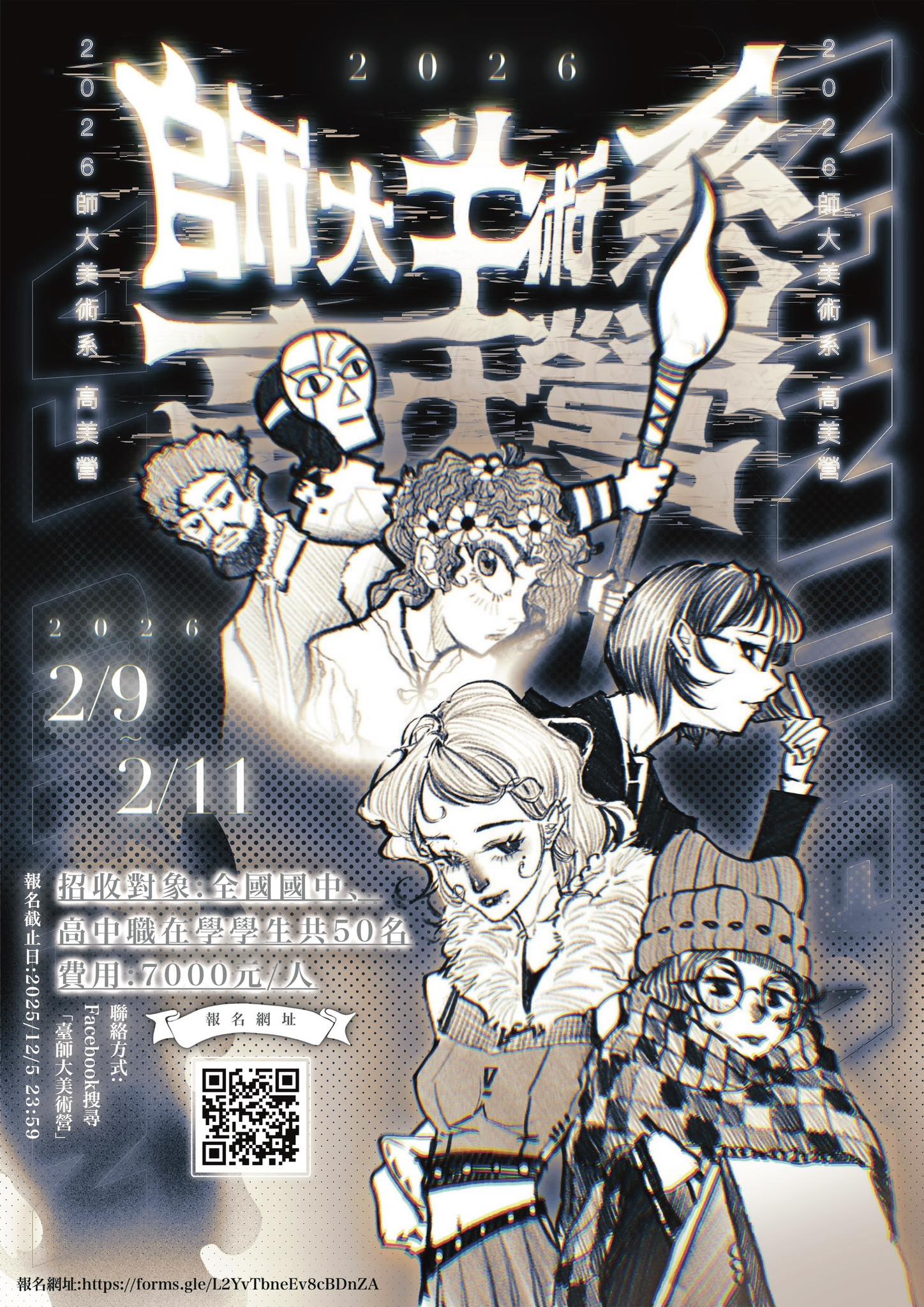 說明: 🔥旨揭活動預計115年2月9日至2月11日於本校美術系館及校本部辦理,報名時間自114年11月17日(星期一)上午9時至12月12日(星期五)下午12時止,因名額有限,將經工作人員審查後,擇優錄取50名學員,詳細活動內容及相關報名方式請參考簡章。 🔥《2026 臺師大美術營:八維畫廊》熱烈招生中! 報名時間加開延長至12/12在 AI 深度介入藝術的未來,眾多創作者逐漸迷失,而你將踏入穿越時空的《八維畫廊》,與不同風格的藝術家相遇,重新找回創作的靈魂!今年的美術營包含六場精采課程、精彩講座、懸疑劇場、解謎活動與熱情晚會,帶你展開一場奇幻創作旅程! 📍 活動資訊 ・日期|2026/2/9 - 2/11 ・名額|50 名 ・費用|7000 元(含食宿) ・地點|臺師大美術系德群畫廊、校本部 ・報名連結:https://forms.gle/L2YvTbneEv8cBDnZA ・活動簡章:https://l.instagram.com/...... ⏳ ⚠️ 報名延長至 12/12 23:59! 抓住最後機會,踏入八維畫廊,開啟屬於你的藝術冒險吧! 如有問題請私訊粉專或聯絡:Email|art2026camp@gmail.com FB |臺師大美術營 總籌|蕭樂怡 0973436350 國立臺灣師範大學「美術學系2026國高中美術營」活動