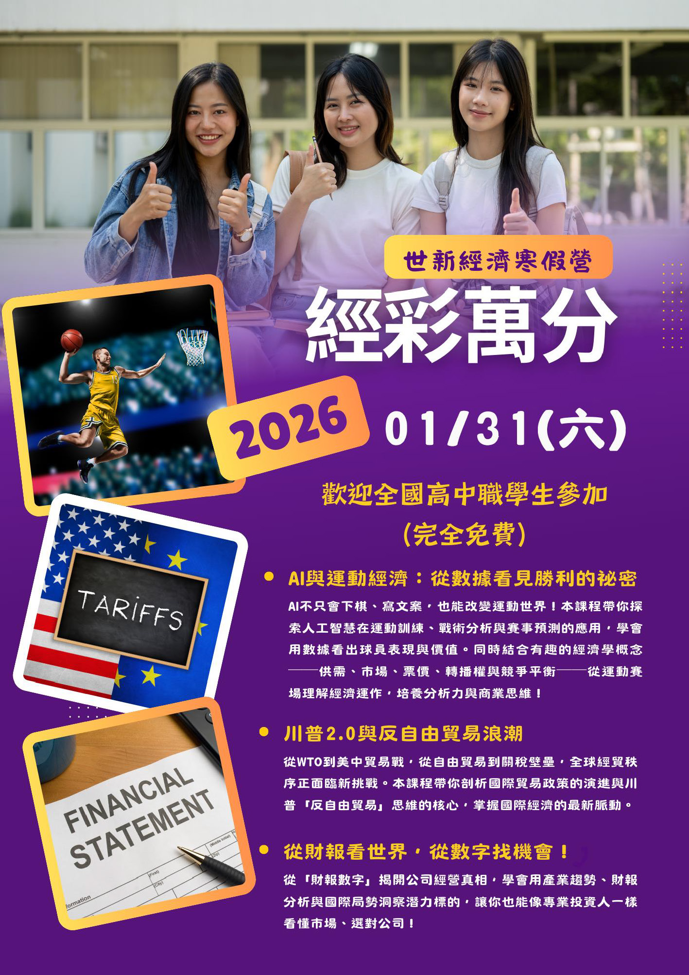 說明: 一、因報名踴躍課程仍持續開放報名中。名額有限,請欲參加者把握機會,亦請惠予協助公告並轉知學生及家長周知。 一、活動時間:115年1月31日(星期六)10時45分至15時。 二、活動地點:本校管理學院大樓4樓M411教室(臺北市文山區木柵路一段111號)。 三、參與對象:全國高中職生(活動全程免費)。 四、報名自即日起至115年1月12日(星期一)止。相關公告可至本校經濟學系系網(https://econ.wp.shu.edu.tw/)查詢。 世新大學「2026世新大學經濟營《經彩萬分》」