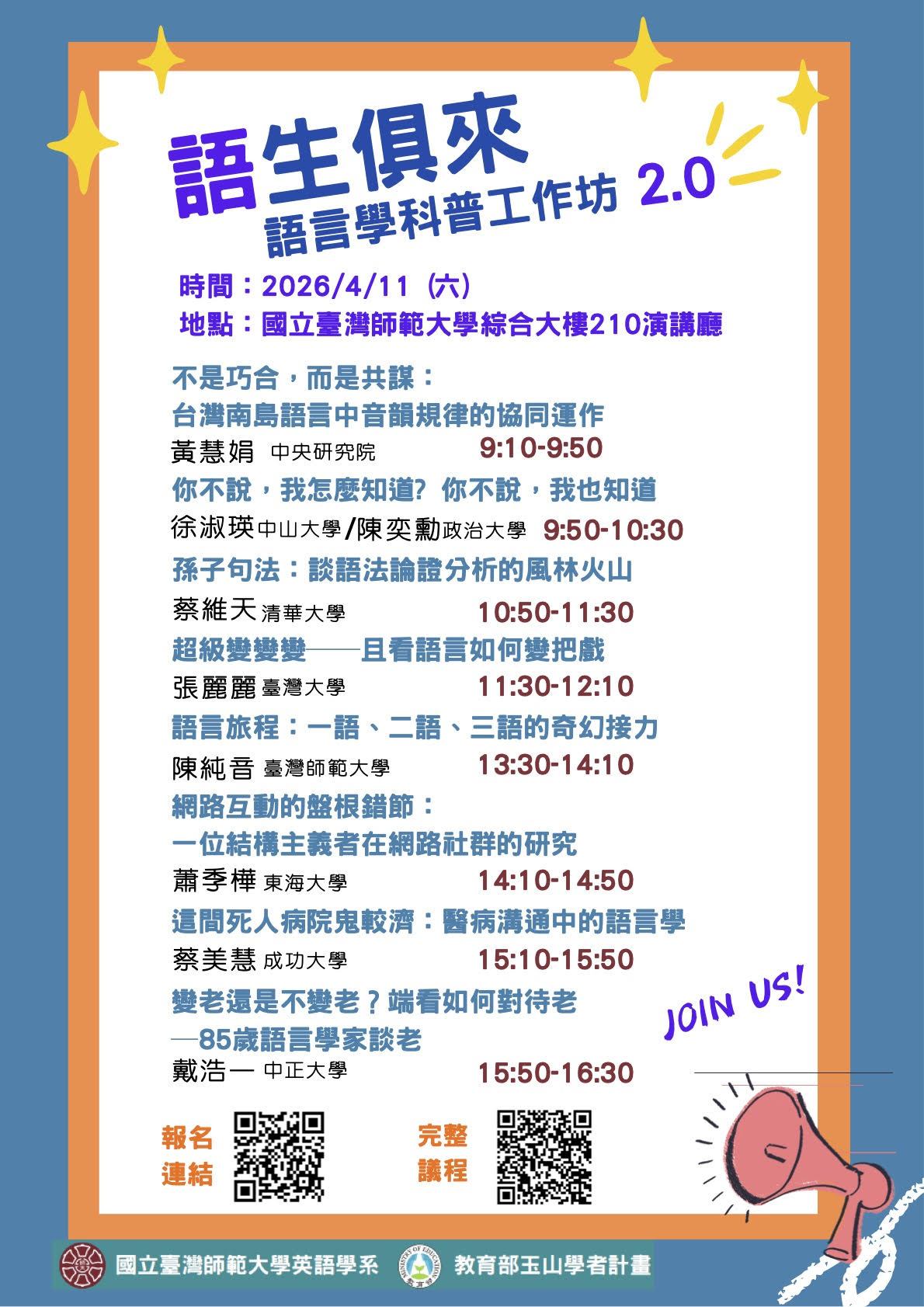 台灣語言學學會與國立臺灣師範大學英語學系合作 為推廣語言學知識並促進跨域交流,台灣語言學學會與國立臺灣師範大學英語學系合作,將於 2026 年 4 月 11 日(六)舉辦「語生俱來語言學科普工作坊 2.0」(活動網站連結)。 說明: