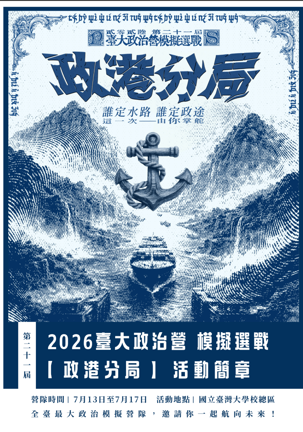 國立臺灣大學2026政治營模擬選戰《政港分局》高中生暑期營隊 臺大政治營是以「模擬選舉」為主軸的大型 RPG 營隊,今年已邁入第二十一屆。我們致力於將真實的總統大選、國會運作及公投議案濃縮於五天的營期中,讓高中生能透過實際體驗,深入了解政治運作與民主價值。 在營隊中,學員將接觸政黨磋商、公民咖啡館思辨及模擬政策發表會,不僅能培養必備的公民素養,更能提升邏輯表達與談判能力,為高中生活留下豐富的課外活動經歷。 我們誠摯希望透過這樣的體驗,讓參加者深刻感受到:「我不僅能理解民主,更能參與公共事務,讓改變發生。」 本年度營隊招生已正式開放,誠摯邀請 貴校老師協助將此活動資訊轉知予 貴校學子。 以下為活動精簡資訊,附件檢附招生簡章供您參考: 【 2026 臺大政治營模擬選戰 營隊資訊 】