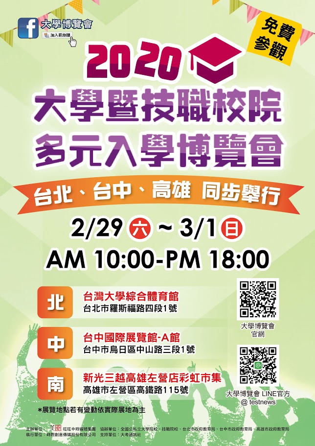 旨揭活動訂於109年2月29日(星期六)、3月1日(星期日)上午10時至下午6時假臺灣大學綜合體育館舉辦。 如有本活動相關問題,請逕洽時際創意傳媒股份有限公司承辦人王雅芬小姐,電話:(02)23087111分機6228、6250。