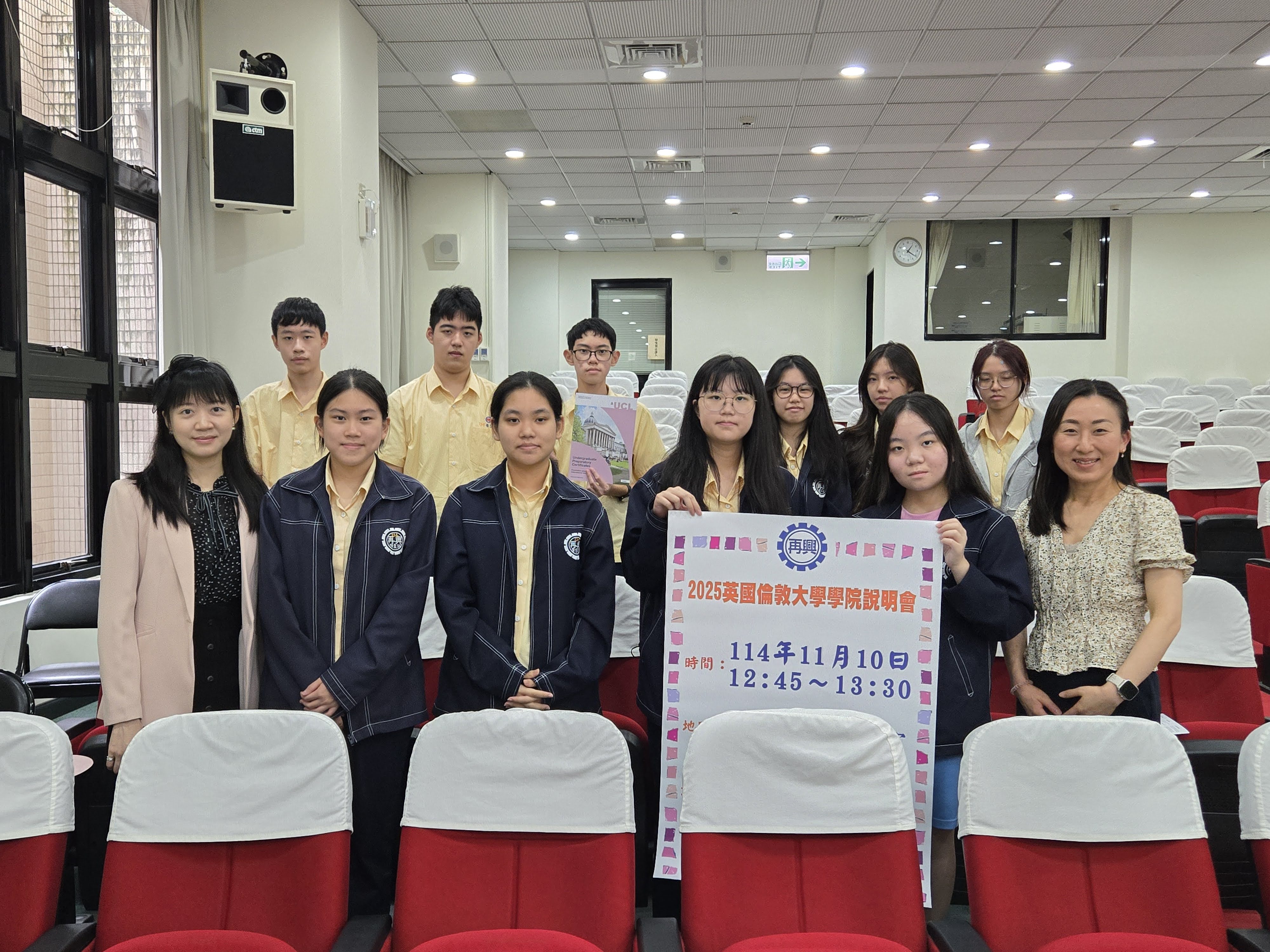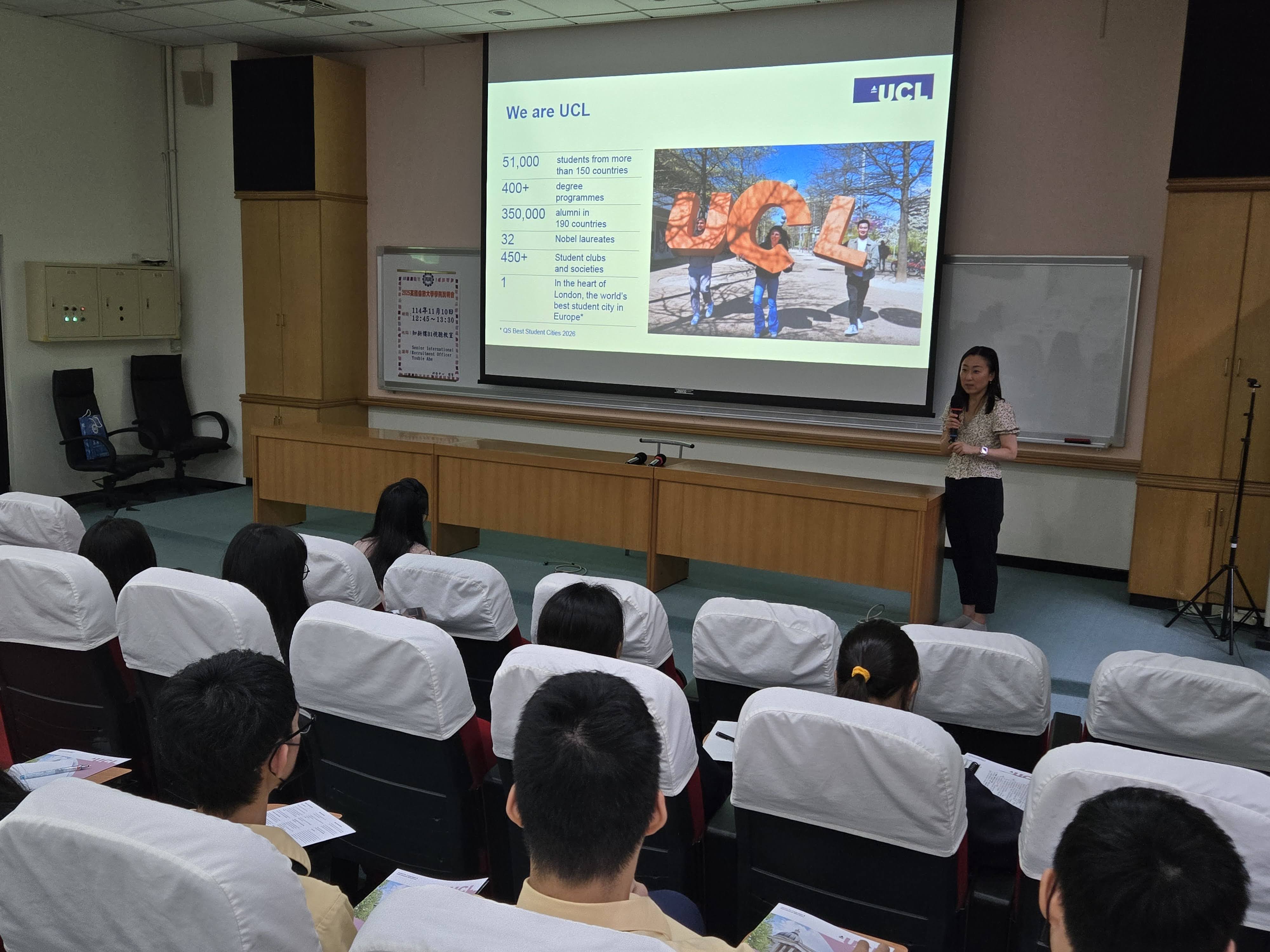 本校11月10日舉辦英國倫敦大學學院說明會,邀請資深國際招生專員Yoshie Abe介紹校園與申請流程。本場說明會共有10位高中部學生參加,內容分為四個部分: 學校基本資訊、國際預科課程介紹、入學條件與申請時程、學生提問時間。