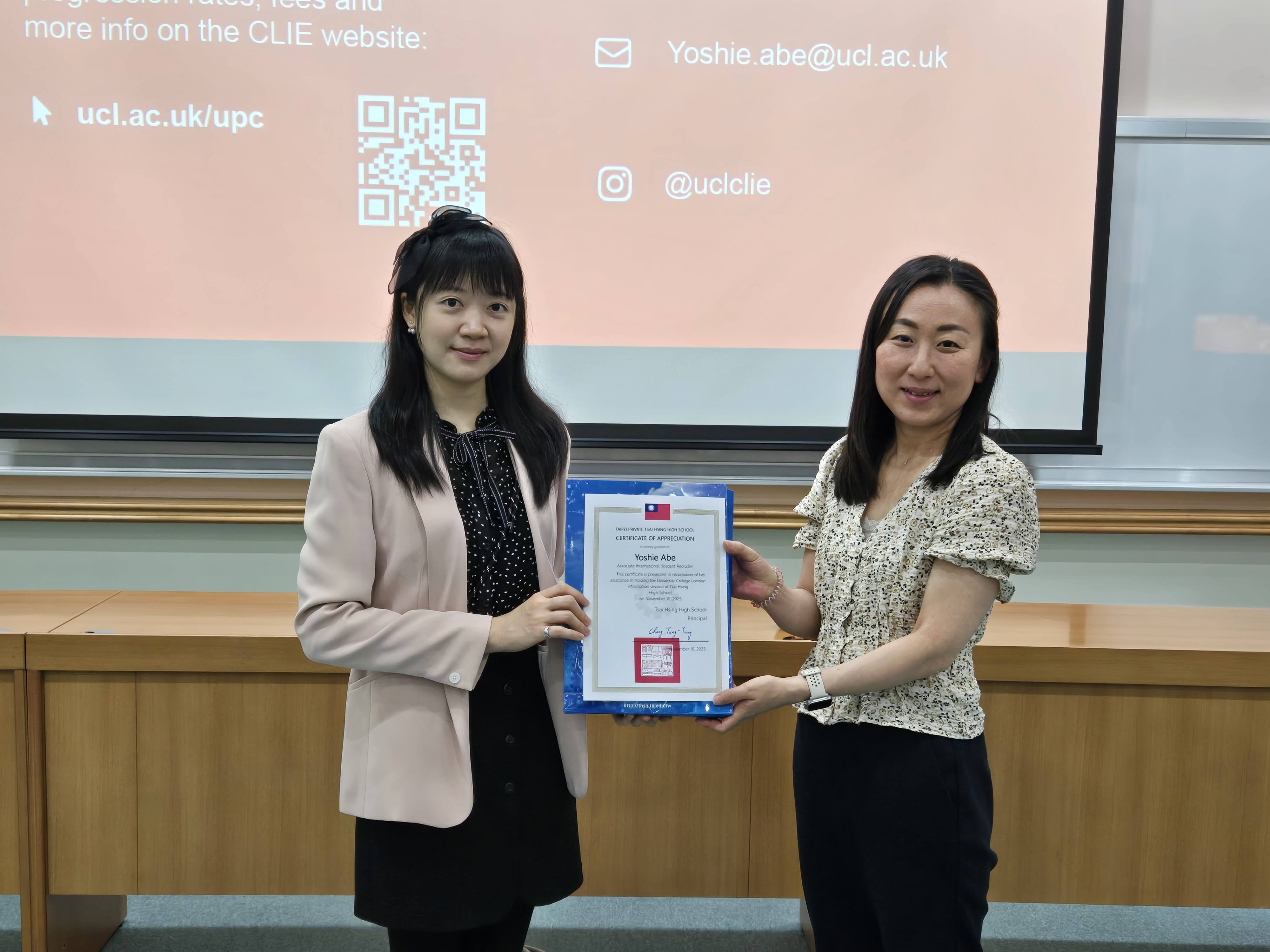 Yoshie首先介紹英國倫敦大學學院以其學術卓越和多元文化著稱,2026 年 QS 世界大學排名第9,是英國第一所向任何種族、階級、宗教背景的學生開放的高等學府,也是全球最早接受女性入學的大學之一。校區位於倫敦市中心,學生能夠享受倫敦的多元文化、藝術活動和豐富的學術資源,優越的地理位置吸引來自世界各地超過 28,000 名國際學生就讀。Yoshie 接著說明該校的國際預科課程Undergraduate Preparatory Certificates (UPC),此課程分成兩種學習路徑:科學工程、人文社會,學生可以依據個人興趣與能力選擇,完成課程後有機會直接進入倫敦大學學院就讀,無需通過UCAS申請。最後Yoshie詳細說明UPC的報考資格、流程與申請期程,並提供相關網站連結給學生了解與提早準備。