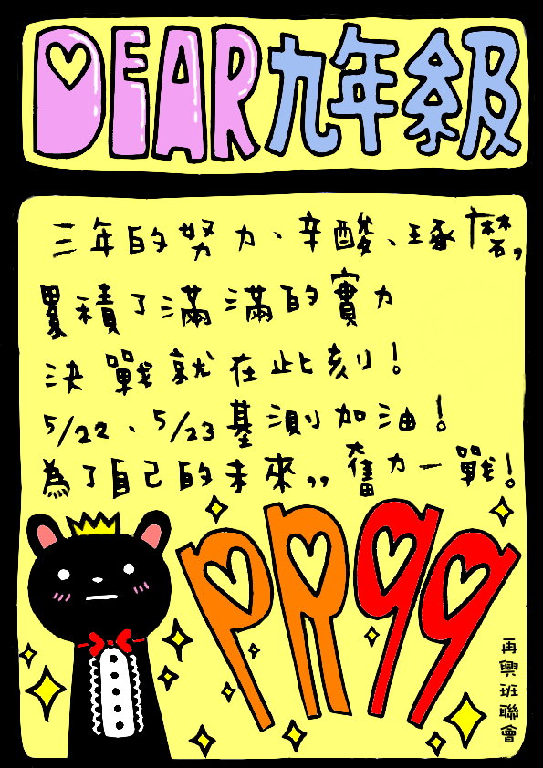 99年全國國中生基本學力測驗將於5月22日(六)、23日(日)登場;本校九年級學生共225名將前往台北市立木柵高工考場應試,班聯會特為學弟妹精心設計加油海報,希望每位考生考試順利、金榜題名。