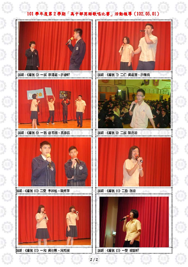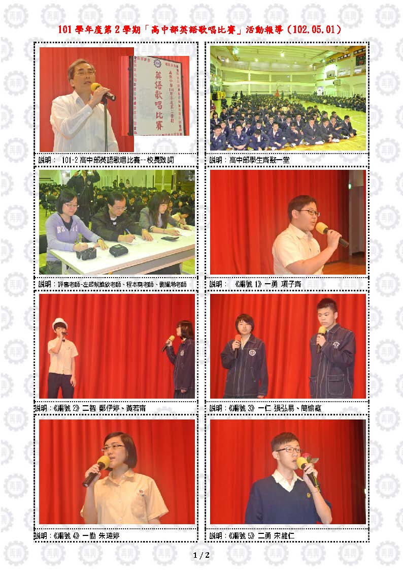 本校於102年5月1日(三)上午週會課進行高中部「英語歌曲比賽」,由高一、高二學生共計13組隊伍參加比賽,席間由劉姵希老師、程本堯老師及蔡維欣老師就參賽者的英語發音、歌唱技巧與臺風創意分別給予評分;同學們發揮實力展現演唱技巧也與台下各班互動交融出活潑熱情的舞台魅力,最後,擇優六組獲得優勝。