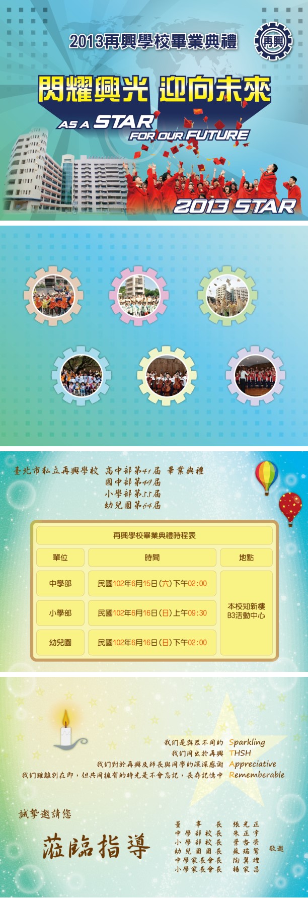 本校將於6月15日(六)、6月16日(日)舉行101學年度再興學校畢業典禮,主題為「閃耀興光 迎向未來」,歡迎各界一起共襄盛舉,共同為本屆畢業同學的成長記憶,畫下美麗的句點。