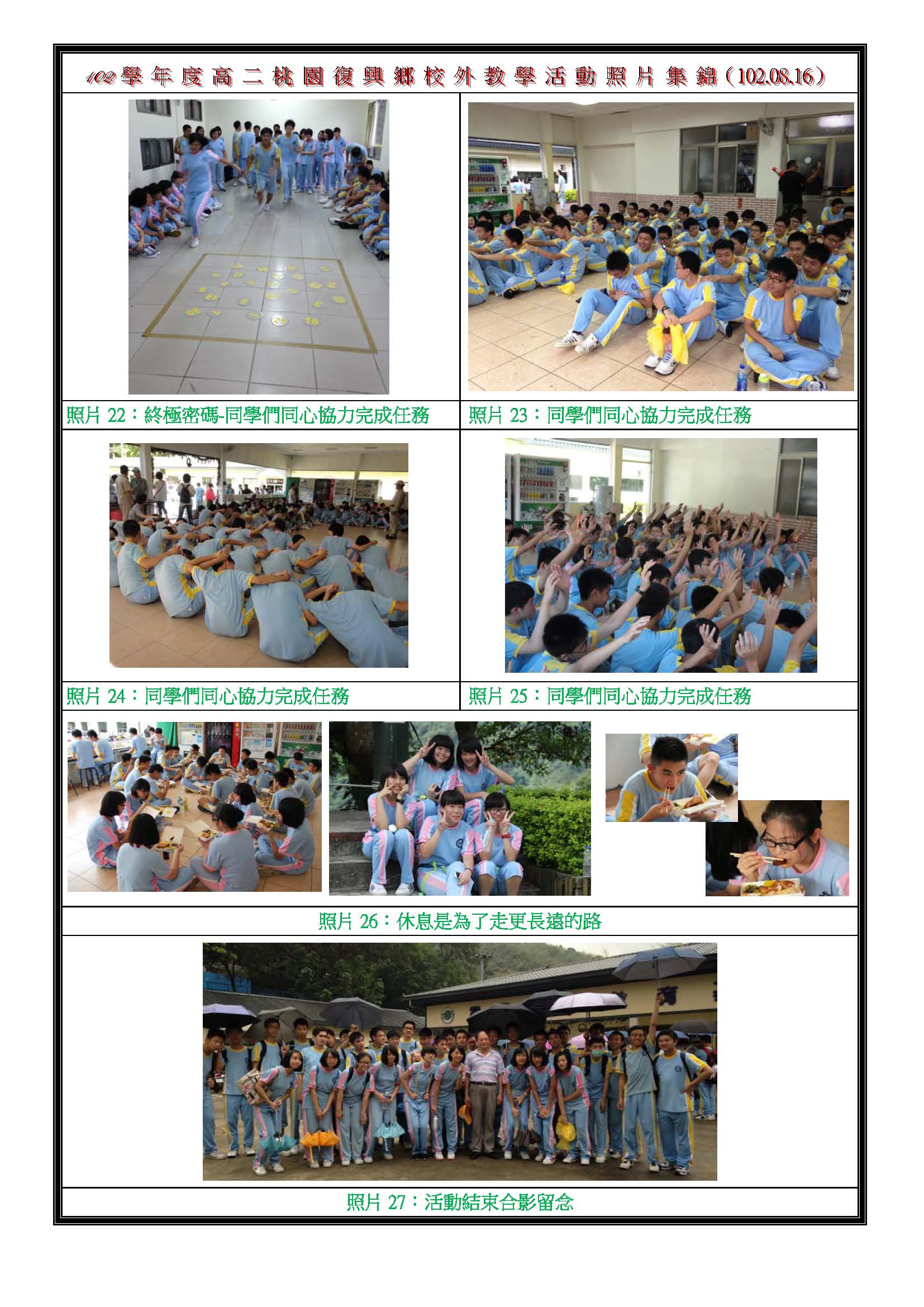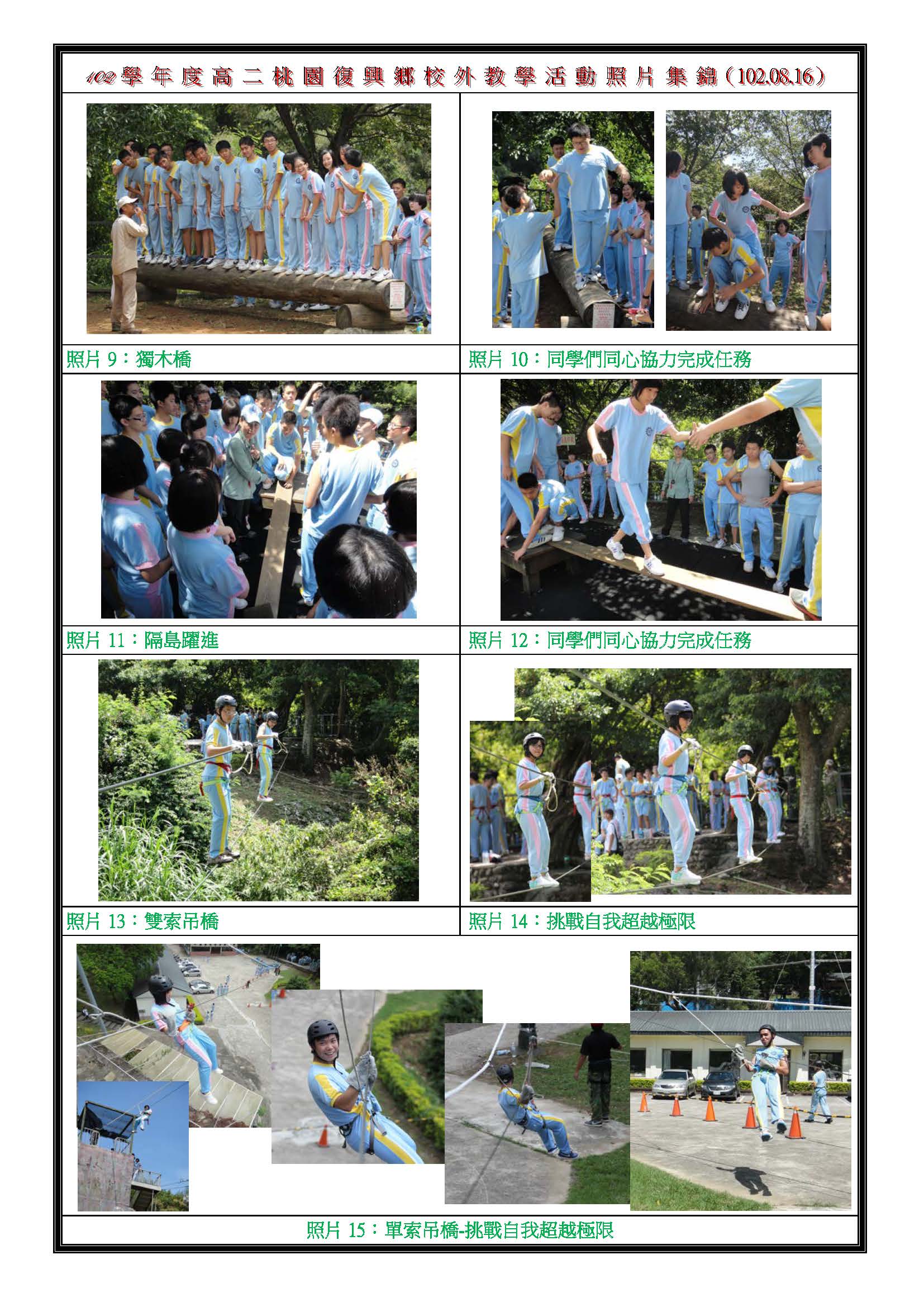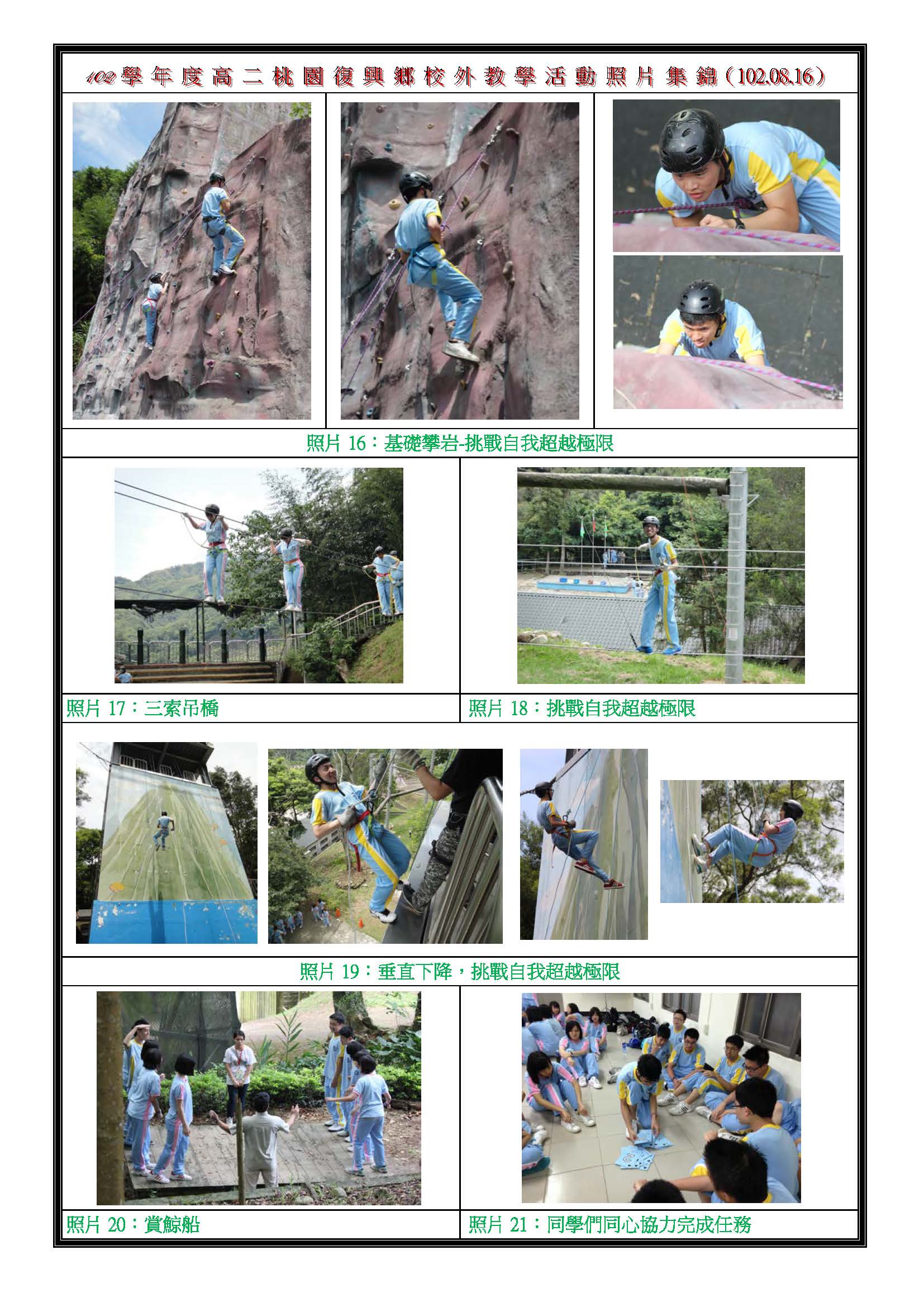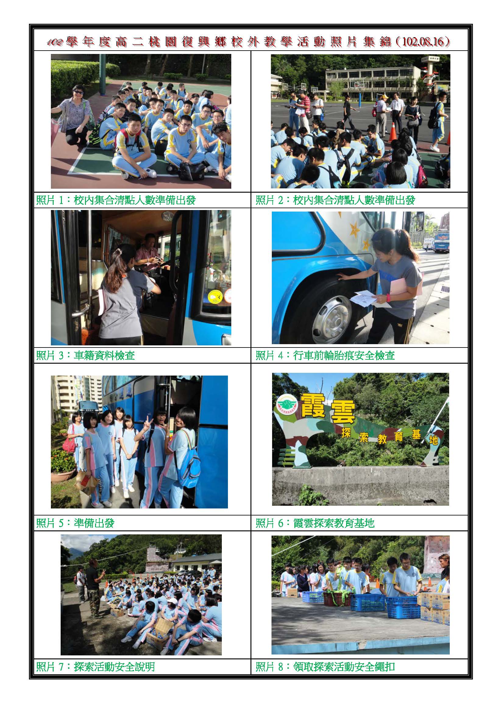 本校為訓練學生冒險犯難、膽大心細之野外求生技能及培養團隊合作精神,並紓解學生課業學習壓力;特由學務處主辦、救國團承辦,於8月16日(星期五)安排高中部二年級全體學生前往桃園縣復興鄉霞雲坪山訓基地實施一日校外教學。當日活動由學務處雷遠郎主任領隊、高中部二年級各班導師及學務處同仁共同率領高中部二年級同學於上午7:30由本校出發,於上午9時整到達桃園縣復興鄉霞雲坪山訓基地,後由專業教官指導本校同學進行攀岩、垂降、雙三索等活動項目。過程中,同學們充分激發自身潛力,展現再興學子永不放棄之精神,克服重重難關,順利完成各項考驗。所有活動於下午3時結束,並於4時45分平安返抵校門,度過難忘又充實的一天。