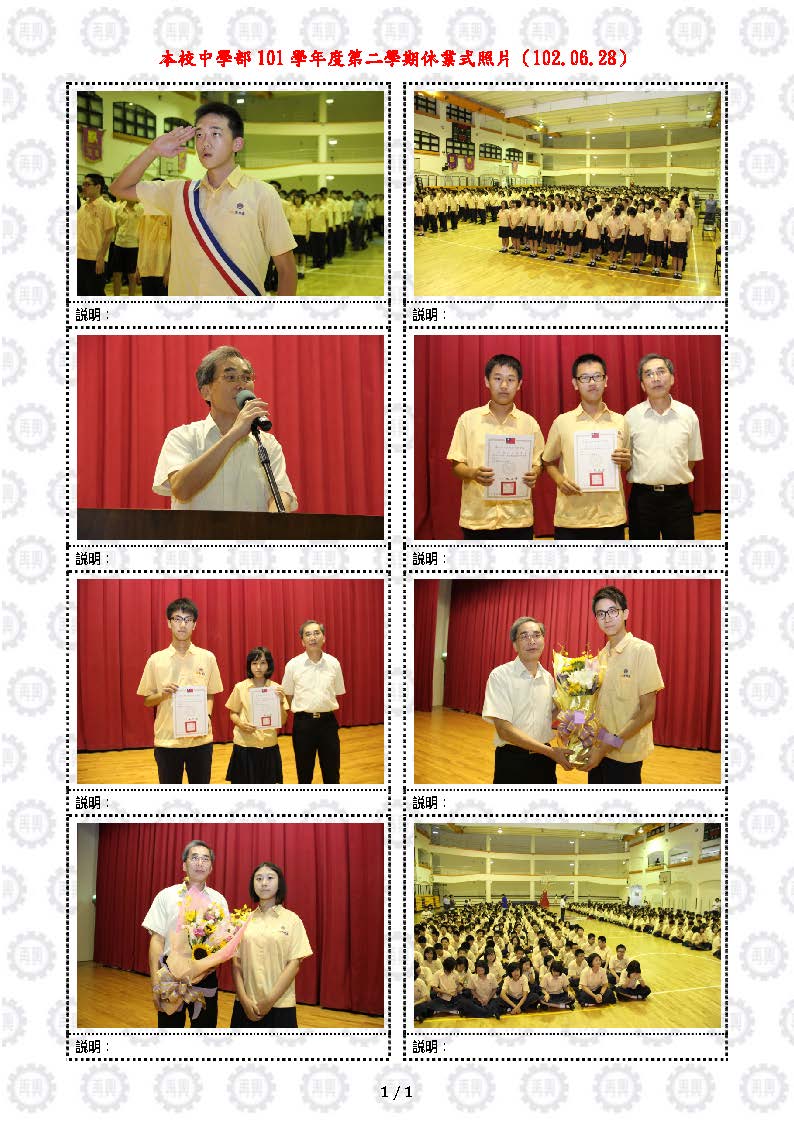 本校101學年度第二學期休業式,102年6月28日下午於知新樓B3體育館舉行。儀式共分國中部及高中部二場,均由朱正宇校長主持。休業式中首先頒發各項校內外競賽為校爭光及學業成績優良學生,朱校長並期勉全體同學於假期中仍須遵守校規並勿忘溫習課業,以準備下學期開學後各項考試。