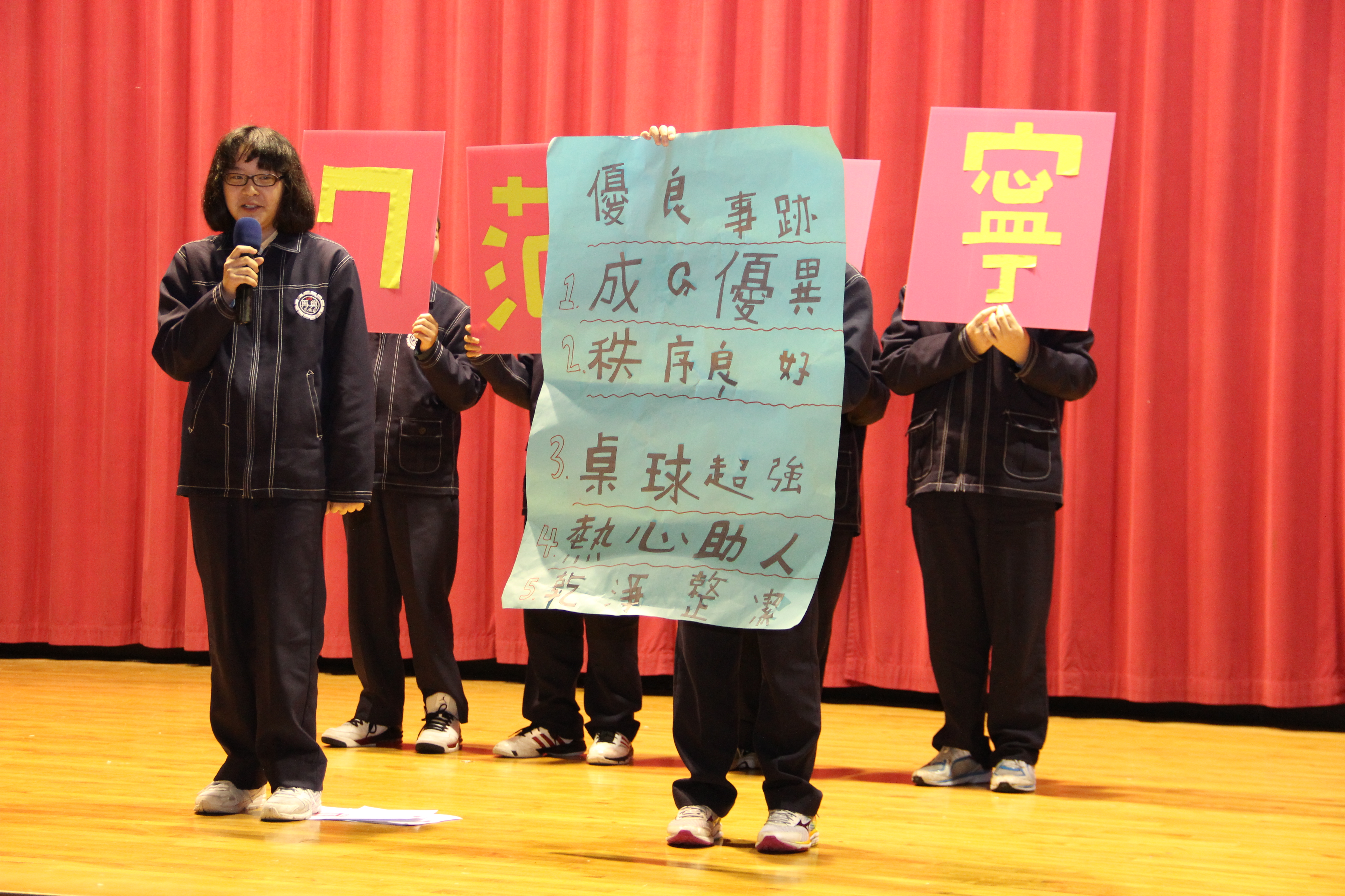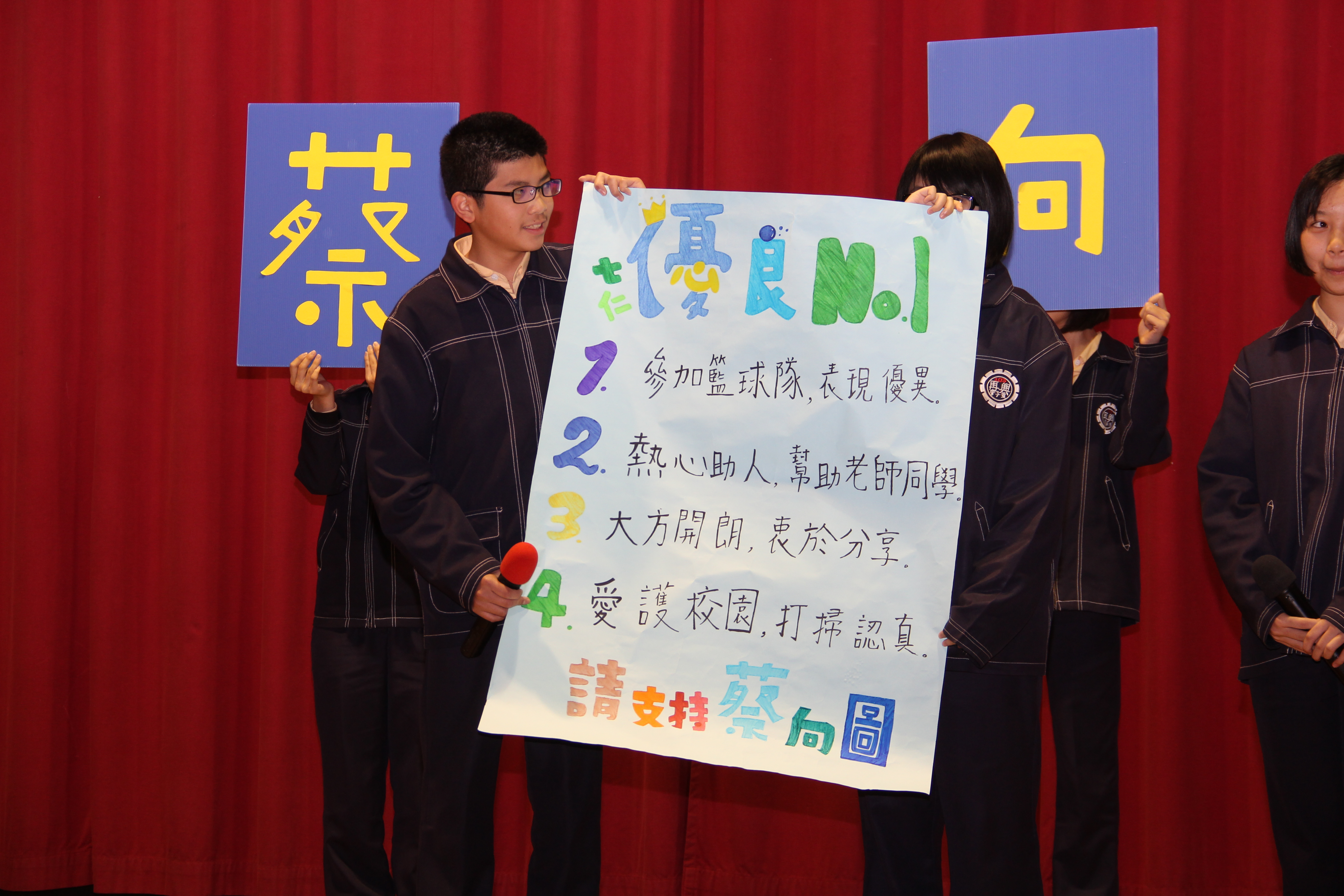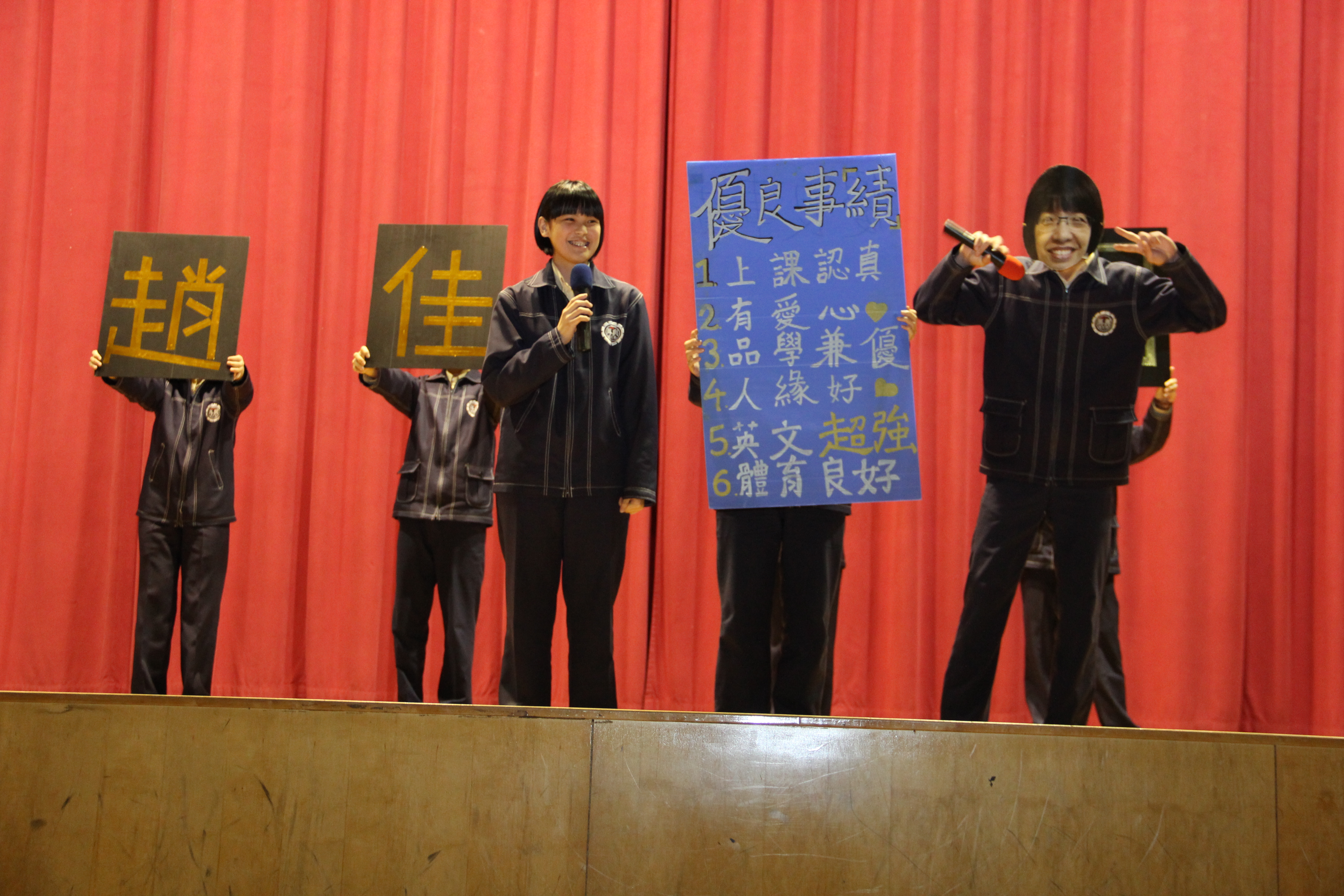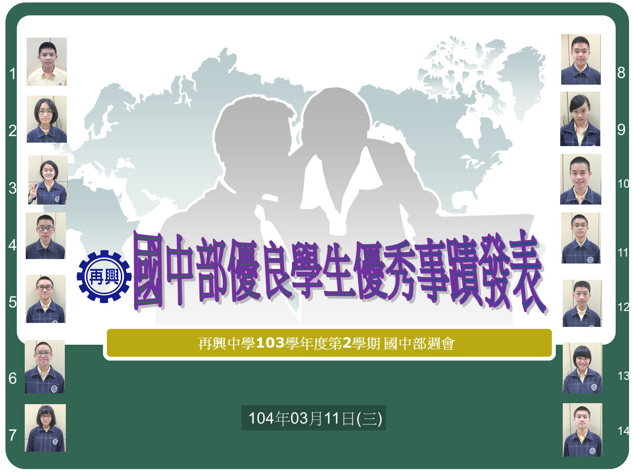 為配合臺北市教育局辦理臺北市103學年度第2學期全市優良學生選拔活動,本校國中部先於3月2日產生班級優良學生,各班級優良學生再依個人意願報名參加全校優良學生選舉後,3月11日(星期三)於週會時間辦理國中部候選人優良事蹟發表會,計有:1號(七仁蔡向圖)、2號(七信簡若伃)、3號(九儉莊晴文)、4號(九良蔡尚達)、5號(八愛陳璿仲)、7號(七愛范家寧)、8號(九溫嚴文駿)、9號(八平陳祈諭)、10號(七孝呂非凡)、11號(八忠林意理)、12號(九恭陳冠瑋)、13號(八孝趙佳穎)、14號(八和陳育丞)。