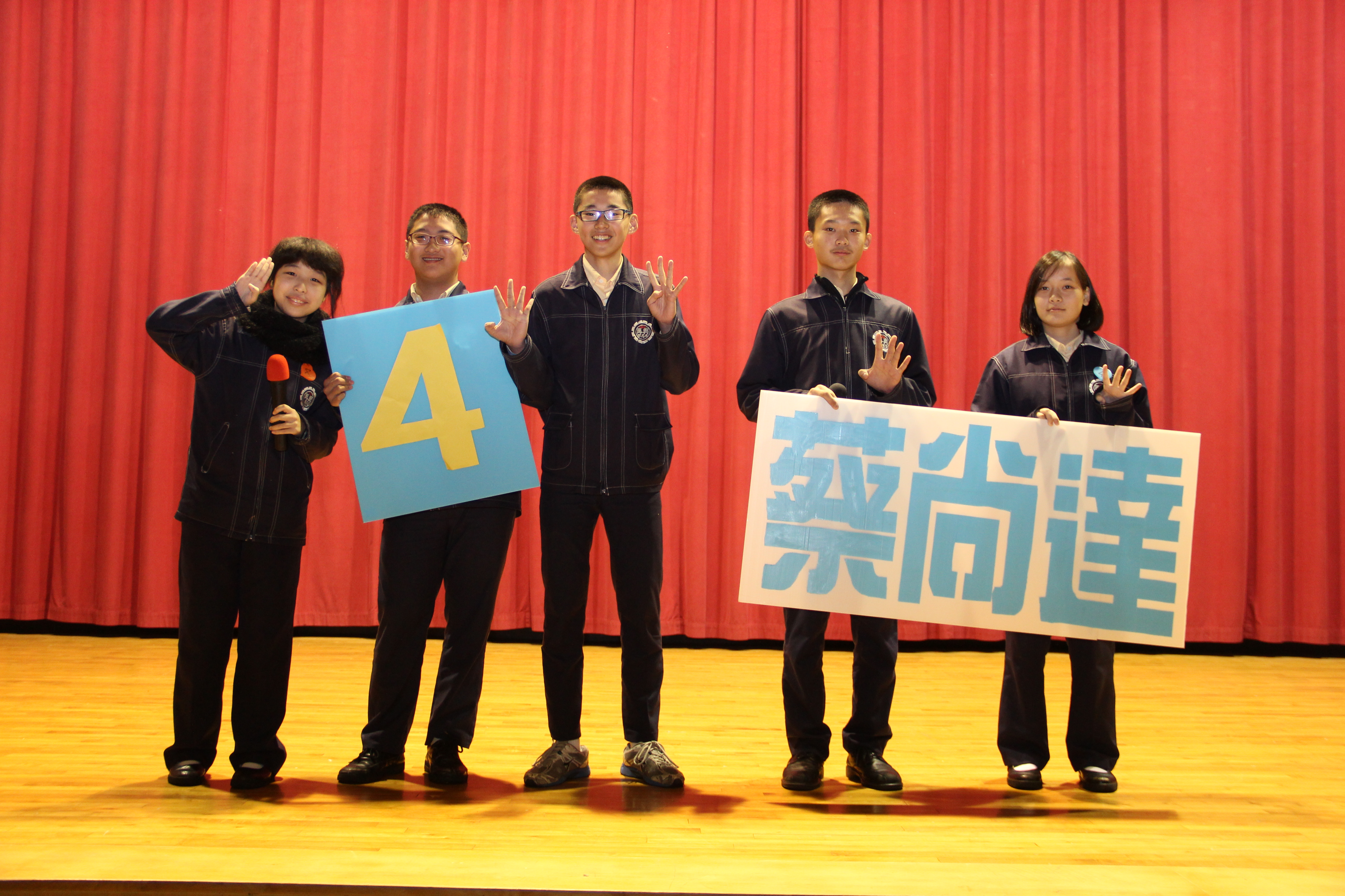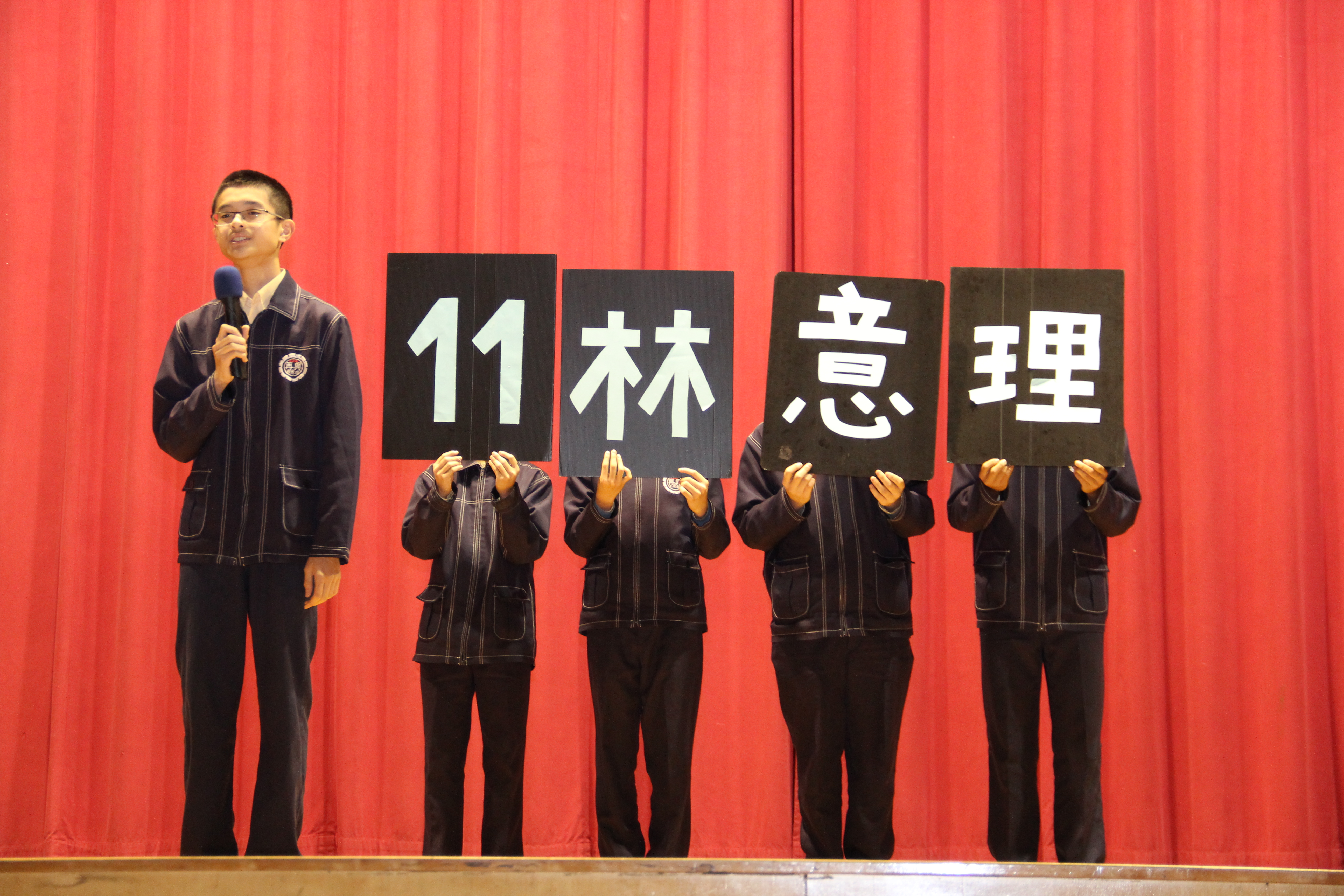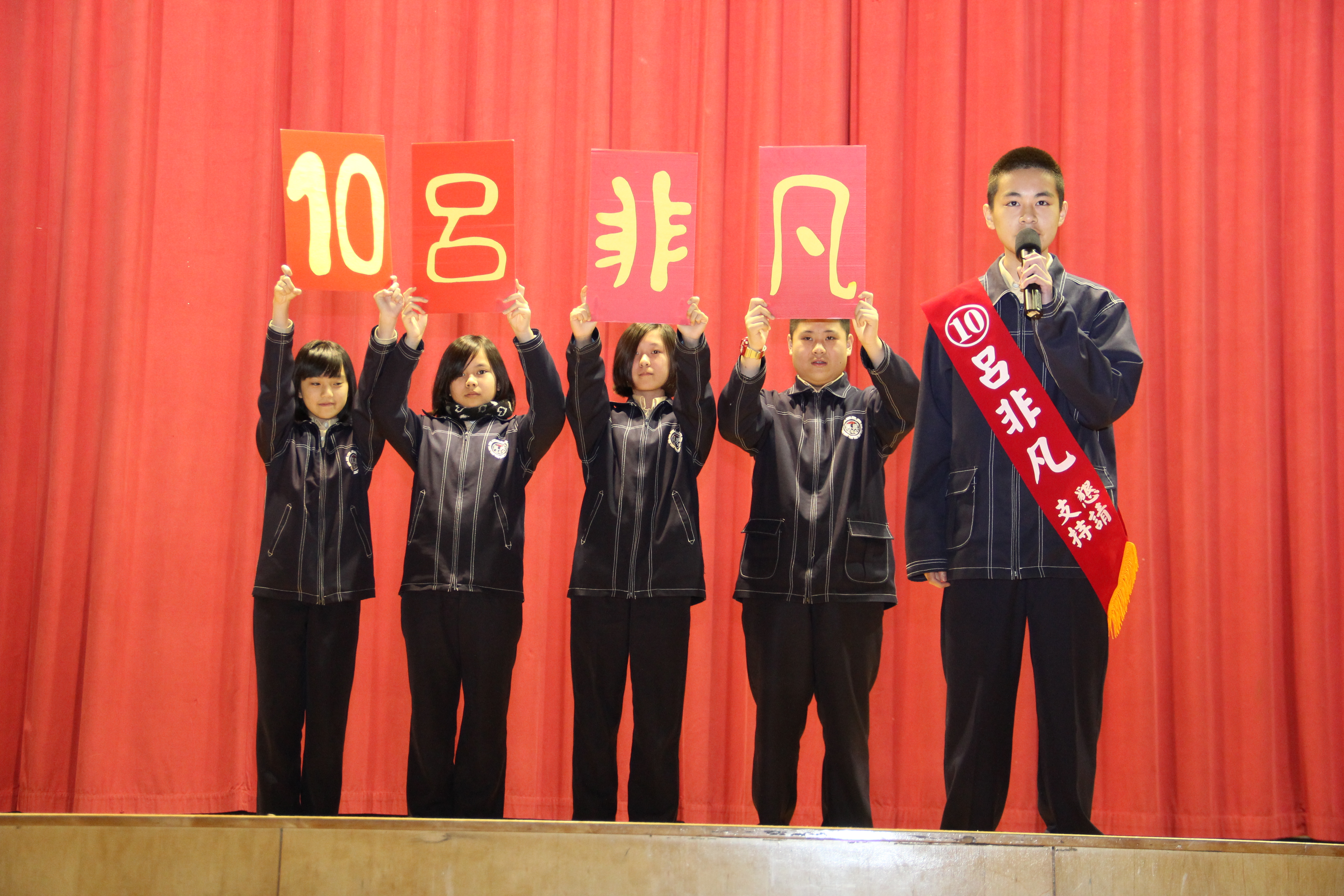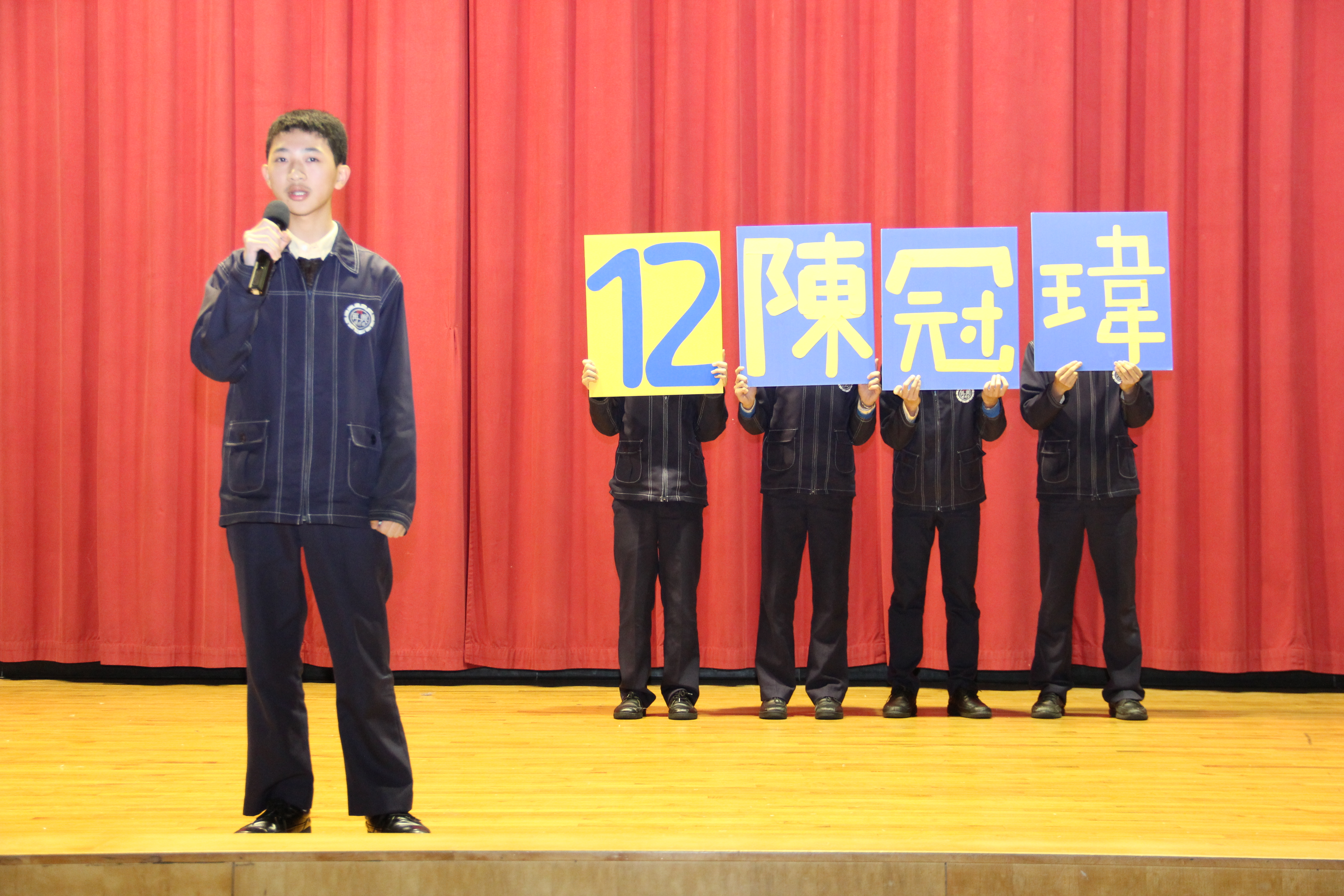 為配合臺北市教育局辦理臺北市103學年度第2學期全市優良學生選拔活動,本校國中部先於3月2日產生班級優良學生,各班級優良學生再依個人意願報名參加全校優良學生選舉後,3月11日(星期三)於週會時間辦理國中部候選人優良事蹟發表會,計有:1號(七仁蔡向圖)、2號(七信簡若伃)、3號(九儉莊晴文)、4號(九良蔡尚達)、5號(八愛陳璿仲)、7號(七愛范家寧)、8號(九溫嚴文駿)、9號(八平陳祈諭)、10號(七孝呂非凡)、11號(八忠林意理)、12號(九恭陳冠瑋)、13號(八孝趙佳穎)、14號(八和陳育丞)。