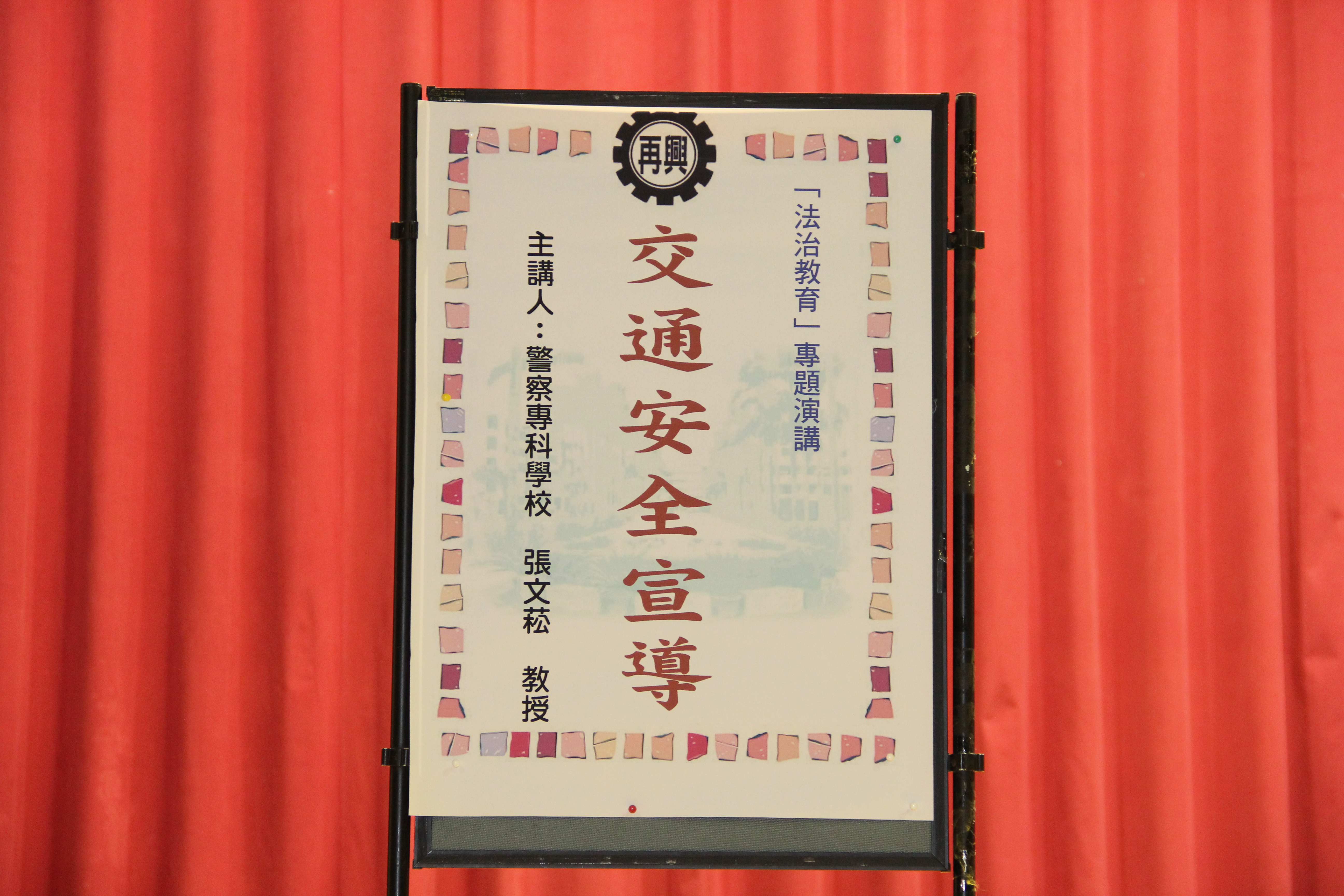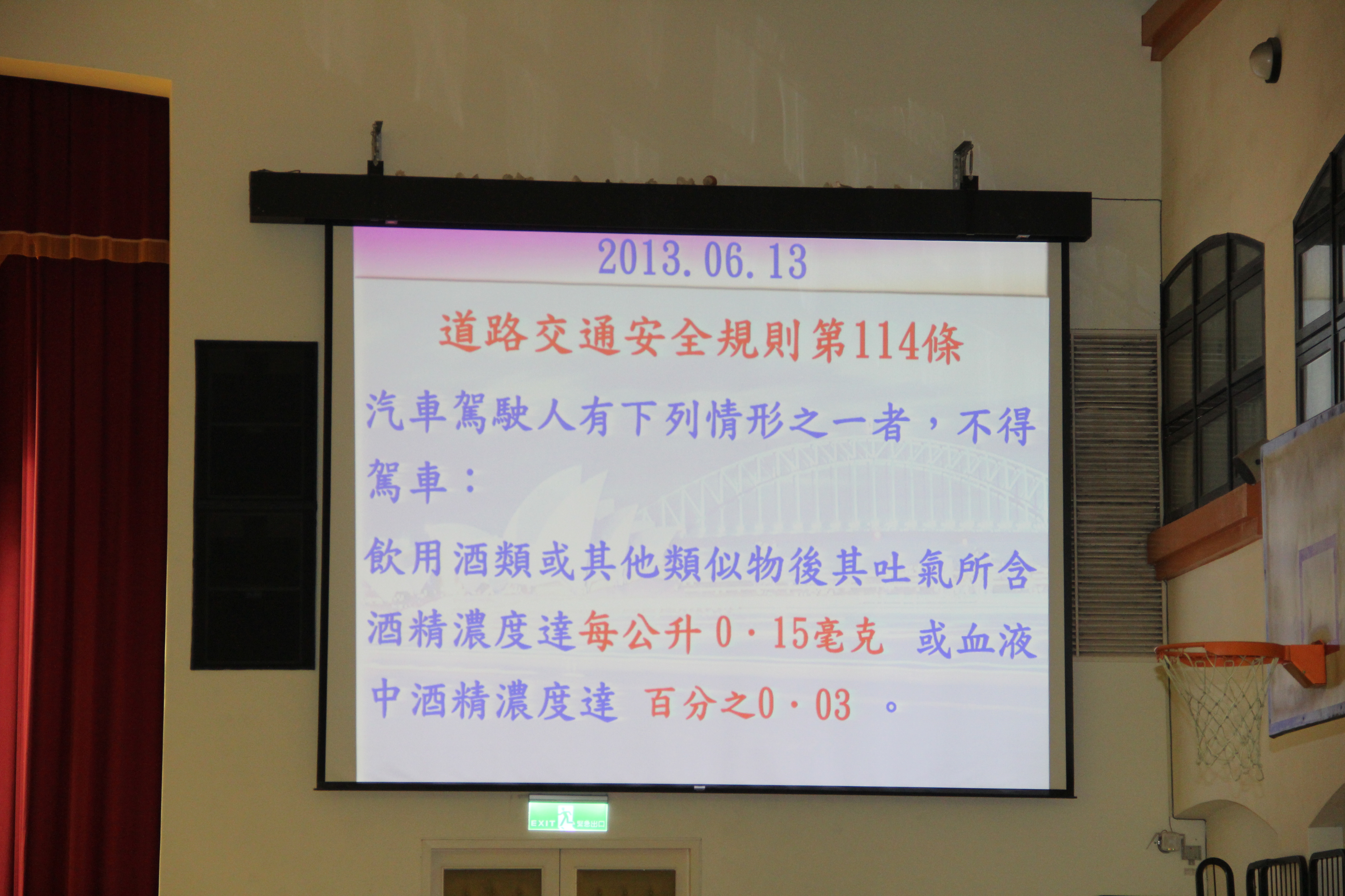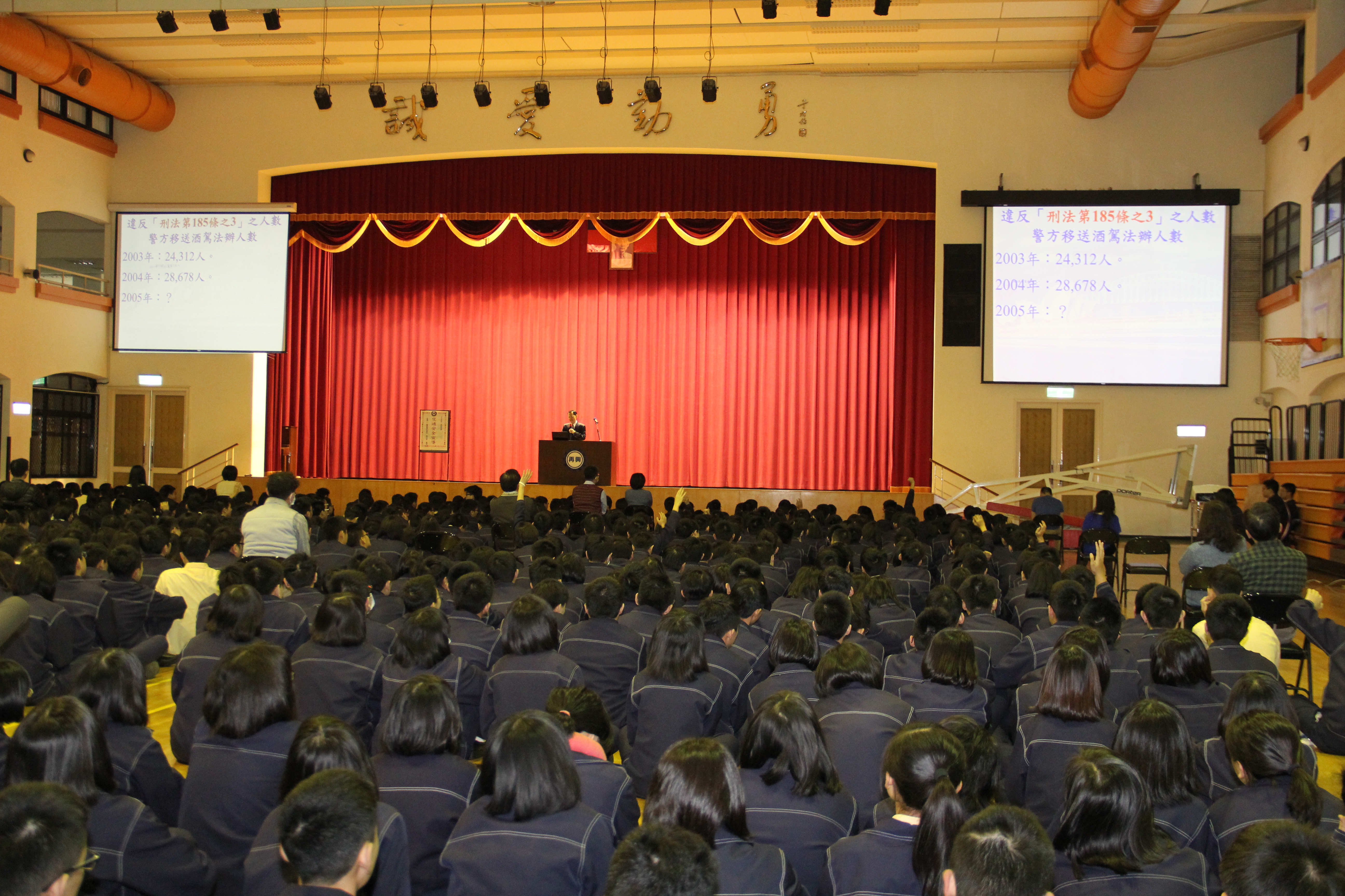 4月15日第10週高中部週會課,特邀請警察專科學校張文菘教授蒞臨本校主講「交通安全」宣導講座。活動於本校知新樓B3體育館舉行,由柯文柔校長親自主持,本校高中部一、二年級及國中部九年級溫/良/恭/儉/讓班全體學生參加,張教授藉由各種交通安全法規介紹與案例分享揭開序幕,用輕鬆詼諧幽默的演講風格幫助學生了解道路交通管理處罰條例的修訂歷史沿革,並希望同學們能提醒家人「開車不喝酒、喝酒不開車」。