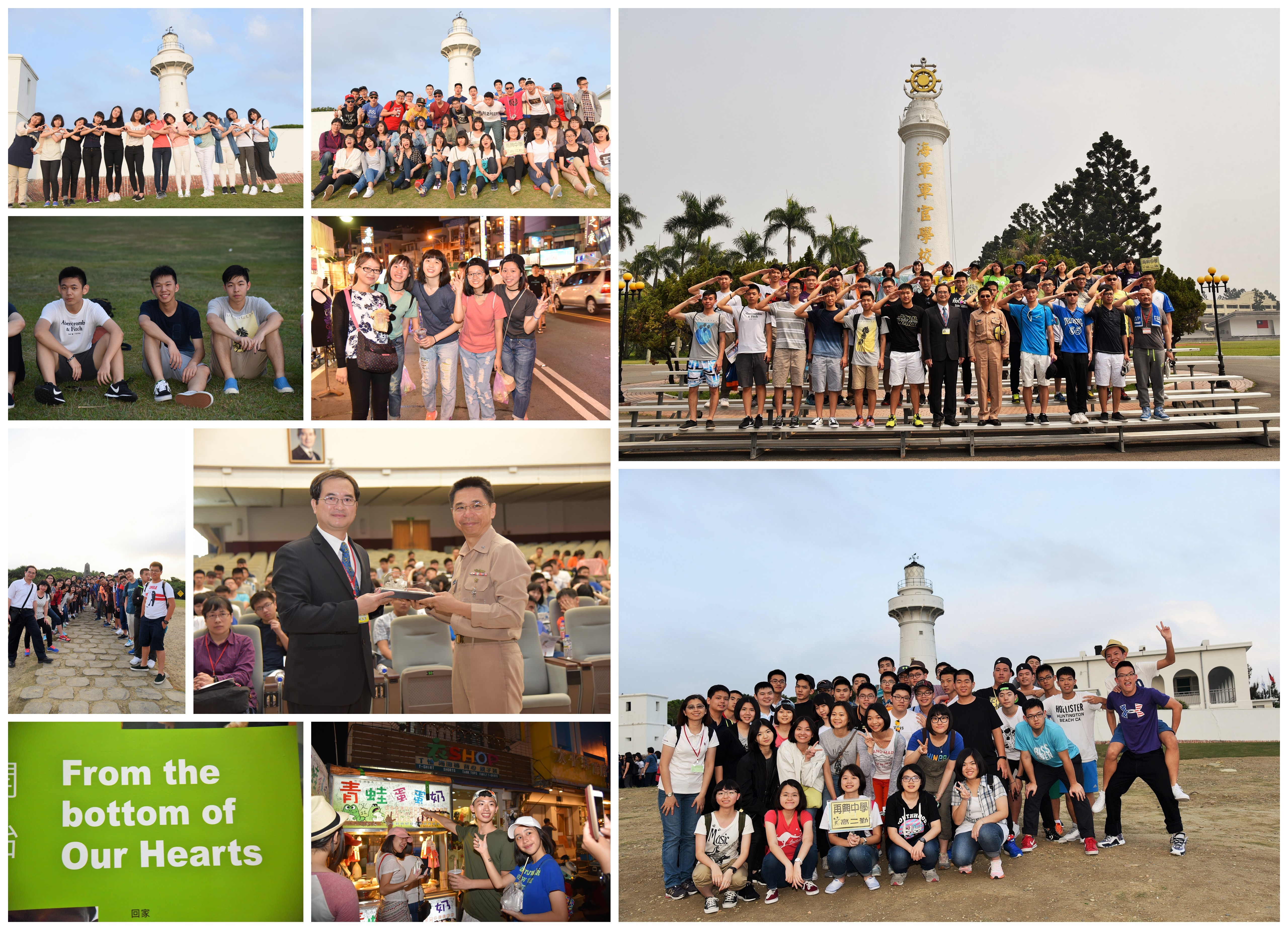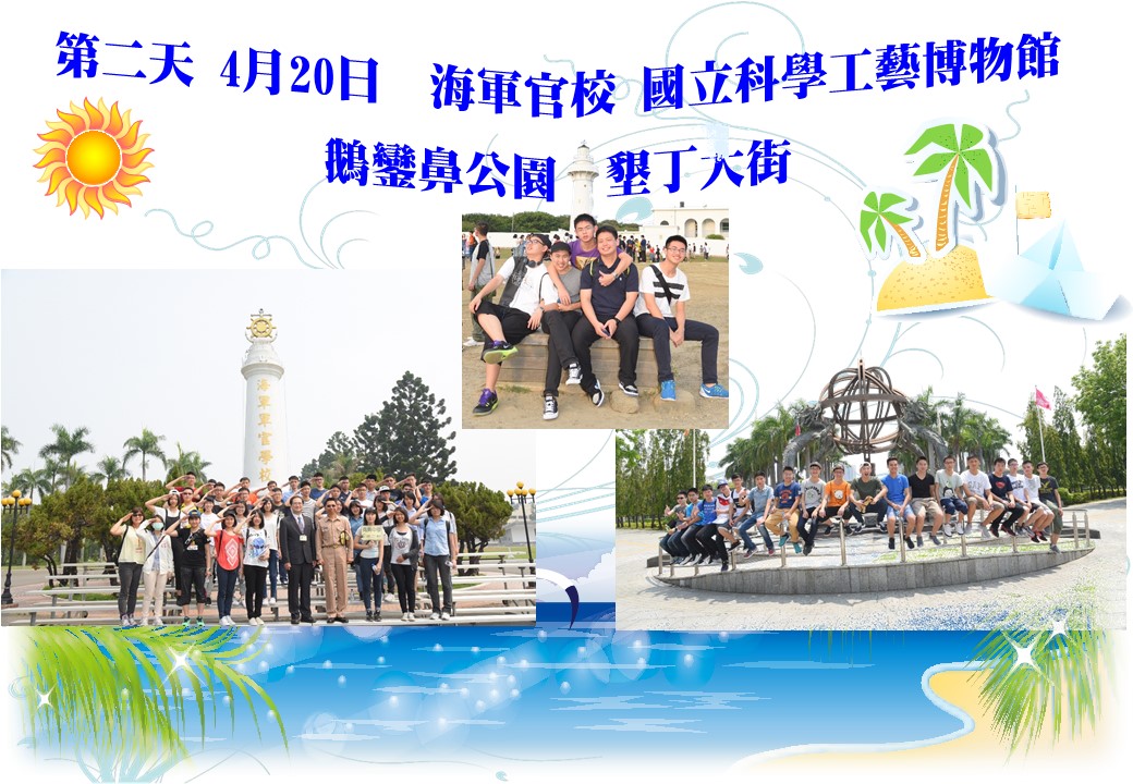 在6:50晨喚後,同學們都準時於7:20享用美味自助式早餐, 並於8:30集合完畢準時自義大出發, 展開第二天國境之南旅途 ! 第一站先來到海軍官校, 校長也專程南下前來, 海軍官校袁校長及官校內長官與大學部同學以高規格歡迎我們, 除了為我們簡介與導覽外,在互贈禮物同時, 也贈送所有同學每人一個船錨紀念徽章讓同學們驚喜萬分...在用過午餐後, 前往高雄科學博物館體驗各項科技操作,,享受一趟科學動腦與動手的體驗之旅...離開科博館, 在南台灣熱情陽光的陪伴下, 驅車朝國境之南續行...下午五點十分來到鵝鑾鼻燈塔..盡情地跳躍取景,草地上開心追逐玩樂, 夕陽下,月亮已經悄悄升起加入我們的行列....當然在月亮的陪伴下, 墾丁大家的消夜採購行, 是這趟旅途的另一項美食之旅....