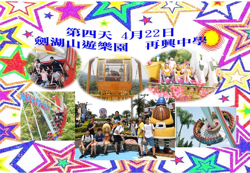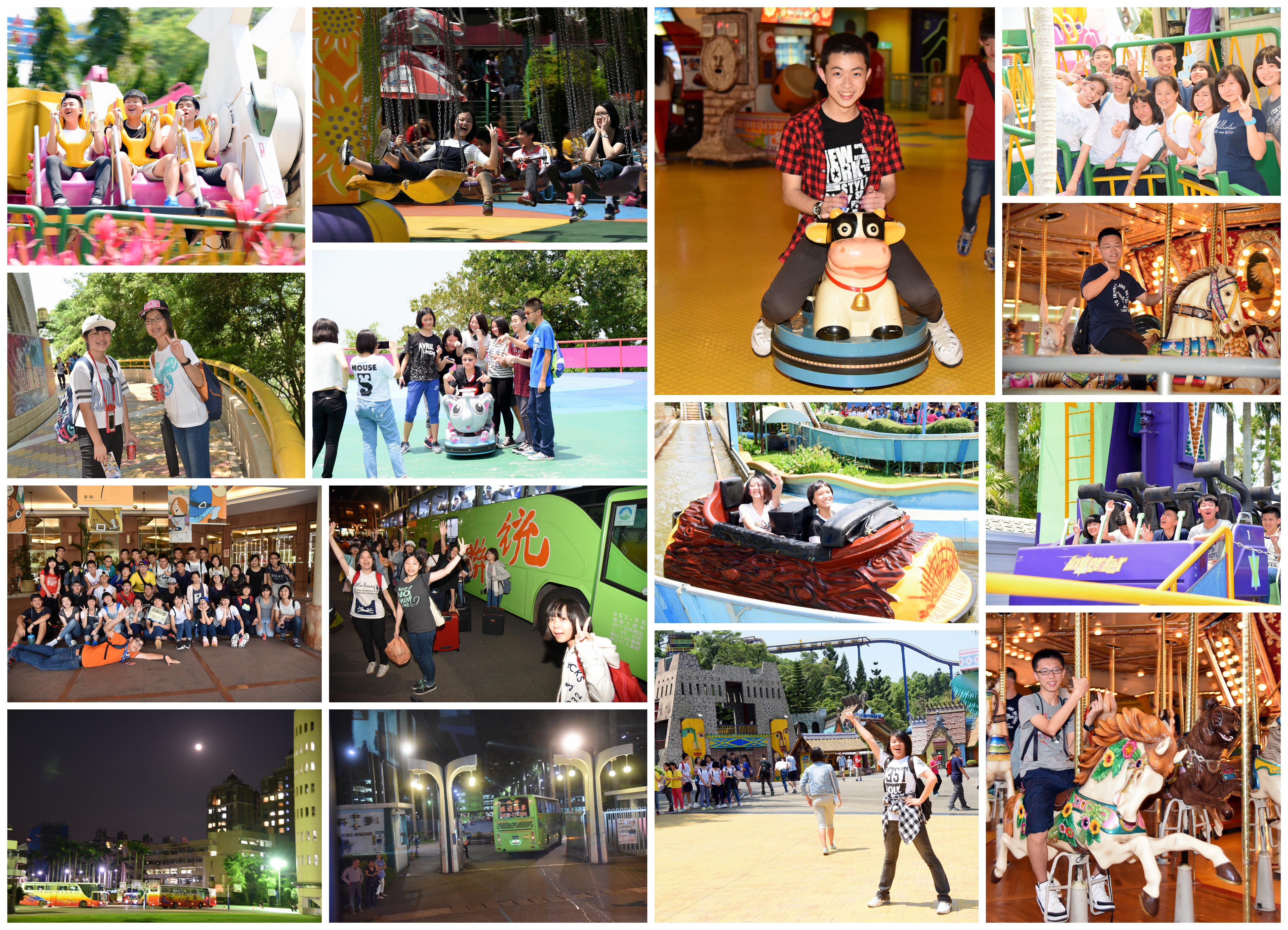 四天三夜的旅行,今天來到了最後一天, 同學們仍然充滿活力熱情, 配合著陽光的熱度, 讓自己的活力跟著燃燒起來~~在八點用早餐後, 於九點半,樂園開門之際,同學們就完全攻佔了整個劍湖山遊樂場, 高二的同學把熱情的尖叫聲與笑聲傳染了今天一起加入的國中部八年級學弟妹們, 八年級的同學在學長姊的帶領下, 紛紛跟著嘗試許多充滿挑戰與刺激的項目~~歡笑加上尖叫聲迴盪在整個山際間...直到下午兩點二十分, 各班開始集合準備回程~~三點從劍湖山開出, 十幾部遊覽車浩浩蕩蕩返北, 途中於關西休息區暫停休息,除了避開新北中和區的下班擁塞車潮外, 也在這裡吃古早味的便當, 大家趁這20分鐘的空檔,紛紛找好朋友拍照合影...旅程於晚上7:28第一輛遊覽車駛入校園而慢慢畫下暫時的句點, 而車下許多親愛的家長們早已等候幾天未見的同學們...在確定大家都離開校園返家後, 這幾天陪伴大家的遊覽車於八點多慢慢駛離校園, 此時的校園間, 一路陪伴我們的月亮也跟著照耀整個校園間...相信一趟美好的旅途,因為有同學把自己帶上旅程, 還有"很多時刻不能重來"的珍惜當下心,與班上好友的共同相處時光, 肯定為大家留下最棒的回憶 !