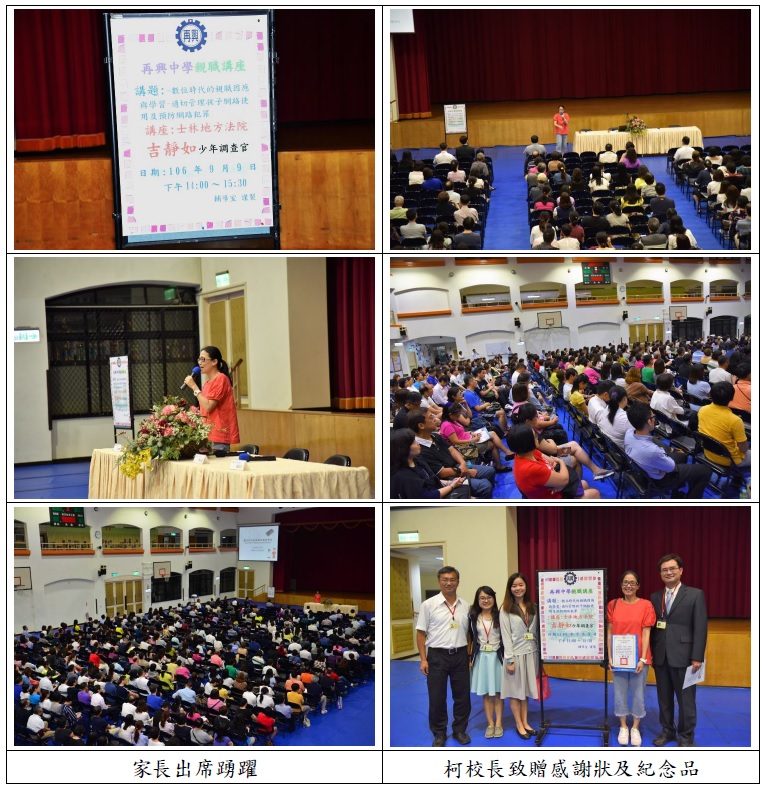 感謝吉靜如調查官憑多年實務經驗,以豐富生動的肢體語言與聲音,主講如此精彩且深具教育意義的講座,讓親師更能深入青少年內心並了解數位時代的因應策略,盼家長能真心接納孩子,不比較手足表現的差異,共同陪伴其走過關鍵的青春風暴期,讓孩子們能從學校畢業後真正展現教養的成果。(詳細演講內容將刊登於106年11月出版之642期再興月刊“心靈饗宴”專欄)。