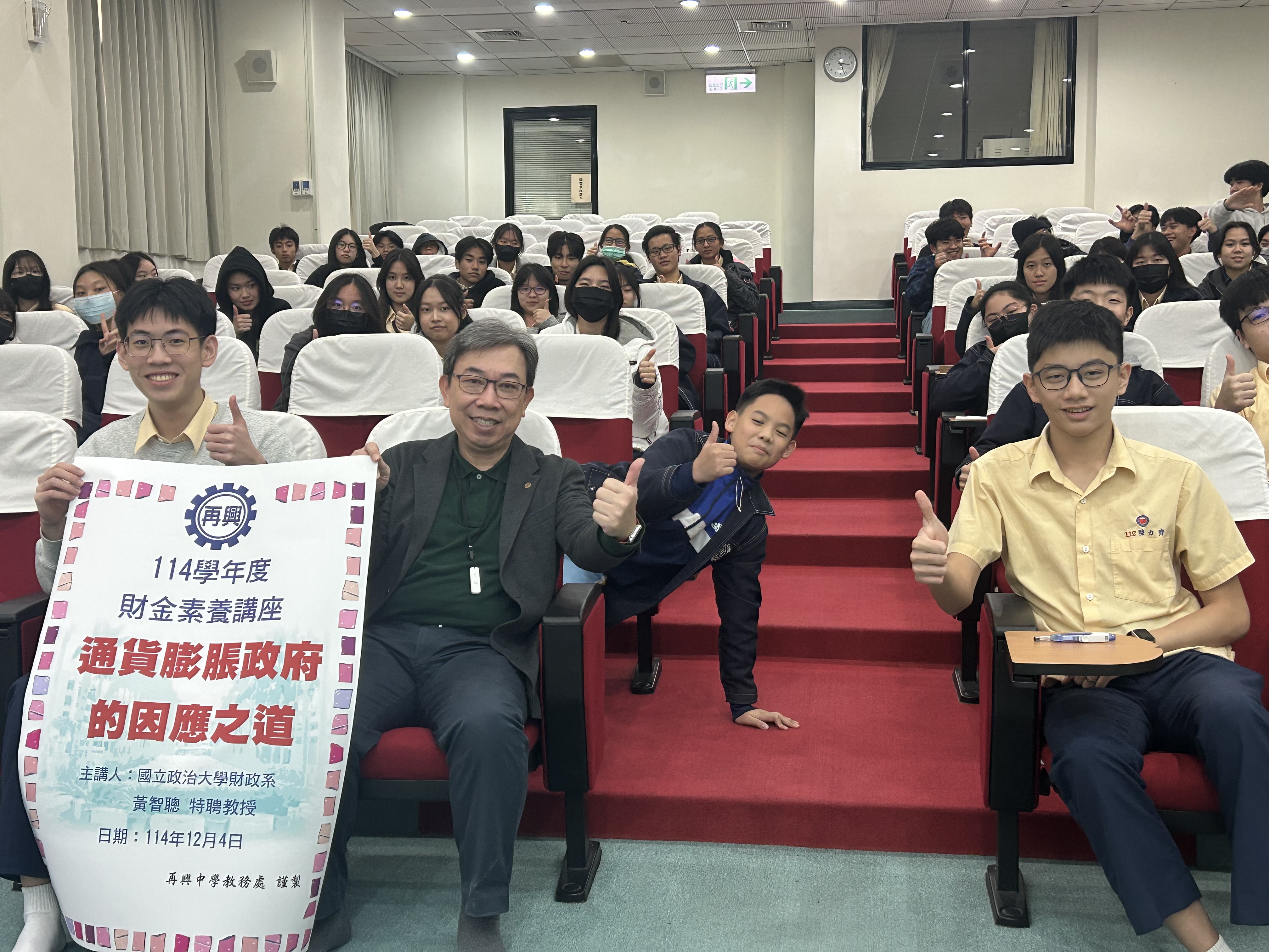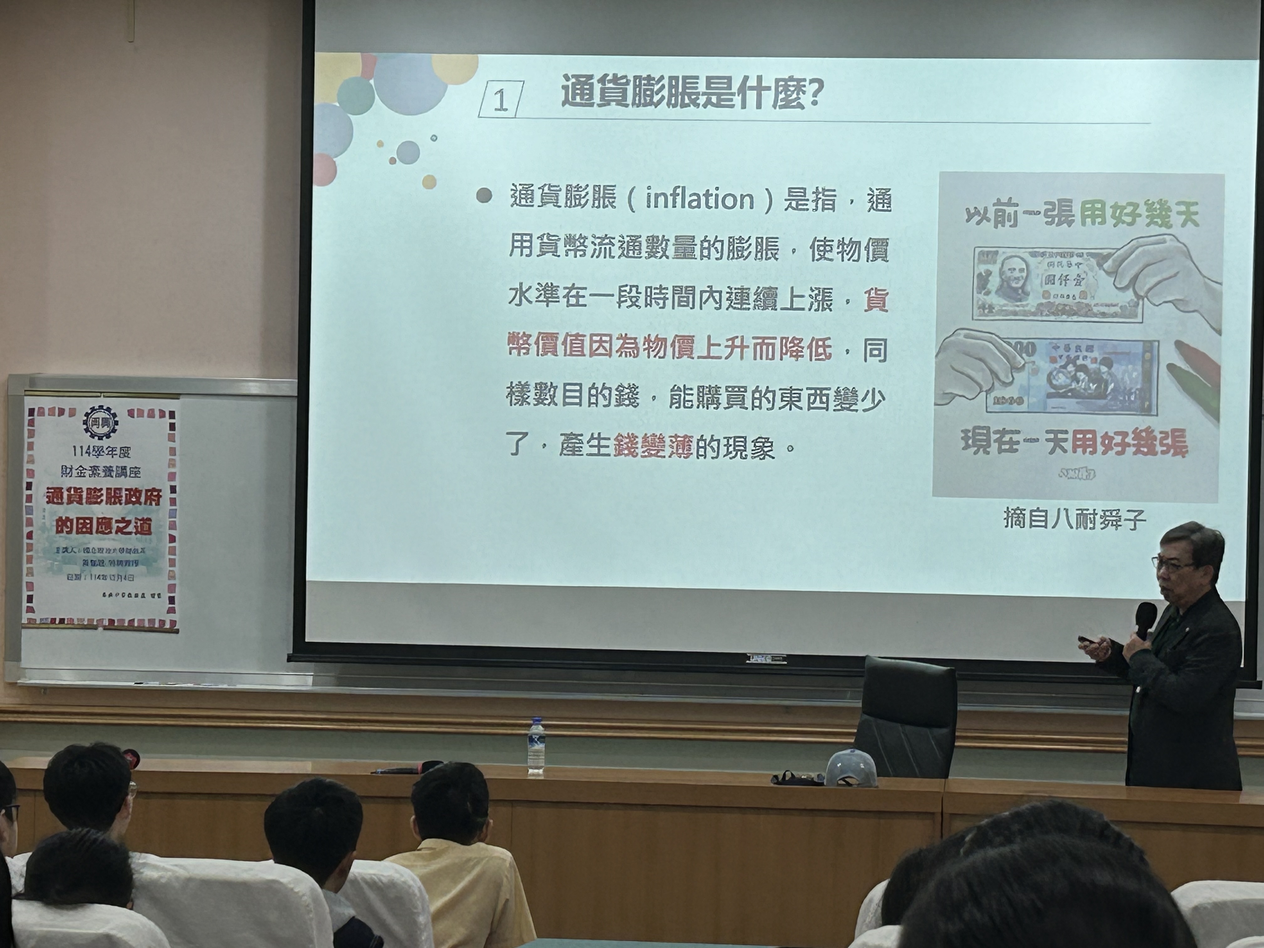 「通貨膨脹」應該怎麼辦? 高一勇班 郭庭妤 陳俞希 報導 12月4日下午本校邀請到國立政治大學財政系黃智聰教授於視聽教室進行專題演講,主題是『「通貨膨脹」應該怎麼辦?』,分享關於通貨膨脹的大小事及基本財政知識。 為什麼會有通貨膨脹和其計算方式 通貨膨脹所造成的影響 各國政府的因應之道 - 各國政府透過升息及降息應對國際趨勢 心得 活動相片連結