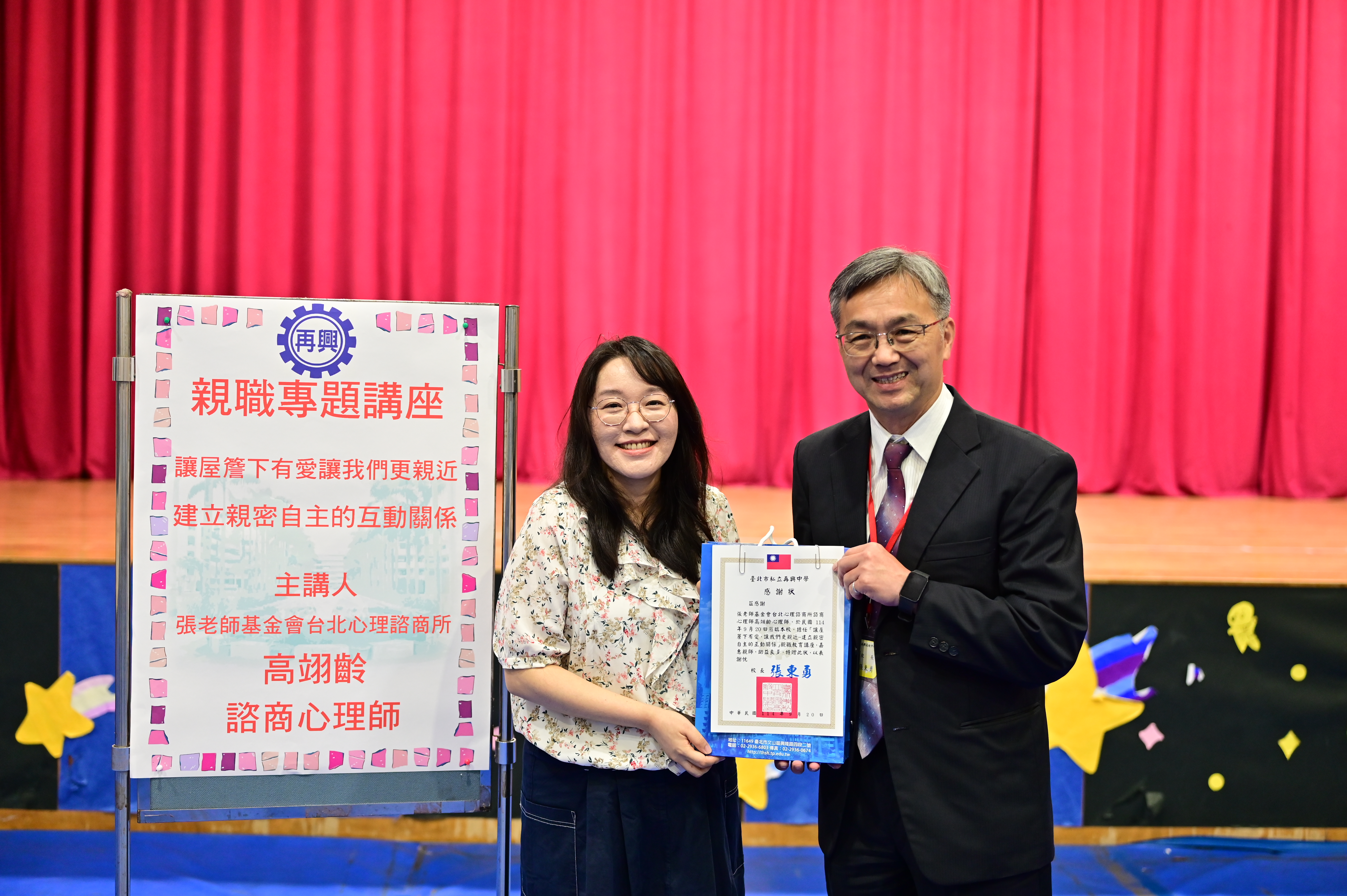 114年9月20日(六)為本校114學年第一學期學校日,輔導室很榮幸邀請到張老師基金會台北心理諮商所高翊齡諮商心理師蒞校,為全校親師分享如何與孩子們建立親密自主的互動關係。 高心理師首先透過一段小朋友選購書包的短片,引導大家看見孩子們在小時候的選擇常常受大人的影響,影片中的孩子會猜想並選擇父母喜歡的書包,當主持人讓孩子們不要管大人想法去選擇自己喜歡的書包時,可以看見孩子們抱著自己喜歡的書包,那發自內心閃亮亮的笑容。高心理師藉此影片說明大人的回應在孩子心靈中是很重要的,孩子們從小其實就能感受到父母對他的期待與要求。 孩子需要「親密」與「自主」,需要被在乎,希望自己在大人眼中是好的,而孩子們越長大又會期待可以有自己的想法與決定,但當小時候需要依賴大人時,照顧者是如何回應,將會衍生出不同的互動模式。 常見的三類「問題互動」包含:1.「順服取悅」,孩子會為了取得與你的親密關係而捨棄自我。2.「對抗攻擊」,為了保有自我而選擇對抗大人指令。3.「遠離迴避」,孩子選擇遠離與大人的關係,既沒有親密也沒有自我。 上述三類狀況都不是良好的互動關係,第一類「順服取悅」的孩子會需要練習把自己當一回事。第二類「對抗攻擊」的孩子需要練習把對方當一回事。第三類「遠離迴避」的孩子則需要練習把關係當一回事。高心理師提醒大家語言是有力量的,不要吝嗇用言語讓孩子知道他是被愛的,他是重要的。 孩子越長大會越希望可以做自己,但我們很難又做自己又符合所有人的期望,所以需要練習允許自己無法符合所有人的期待,更重要的是孩子要練習表達自己的需求並為自己的決定負責。 此時孩子最需要的是大人的支持,而非你給他解決方法。請大人們要去了解孩子發生了什麼事,帶著尊重與好奇去與孩子溝通互動。讓孩子有被愛的親密感,在被適度要求中仍能感覺自己的聲音有被聽到,讓孩子覺得自己有價值、被接納,在與大人的關係中他也可以有聲音,可以當自己。 高心理師給父母5個建議:1.學習轉換自己的心態,請從「照顧者」轉換成「支持者」。2.要有穩定、耐心的陪伴。3.善用與孩子相處的零碎時間營造良好的互動。4.以「理解」結合「規範」一起教育孩子。5.允許孩子有自己的成長過程。期許我們每個大人都能與自己的孩子更親近、共同成長,營造親密又自主的互動關係。 (詳細演講內容刊登於114年11月出版之690期再興月刊“心靈饗宴”專欄)114學年度第一學期學校日親職教育專題講座