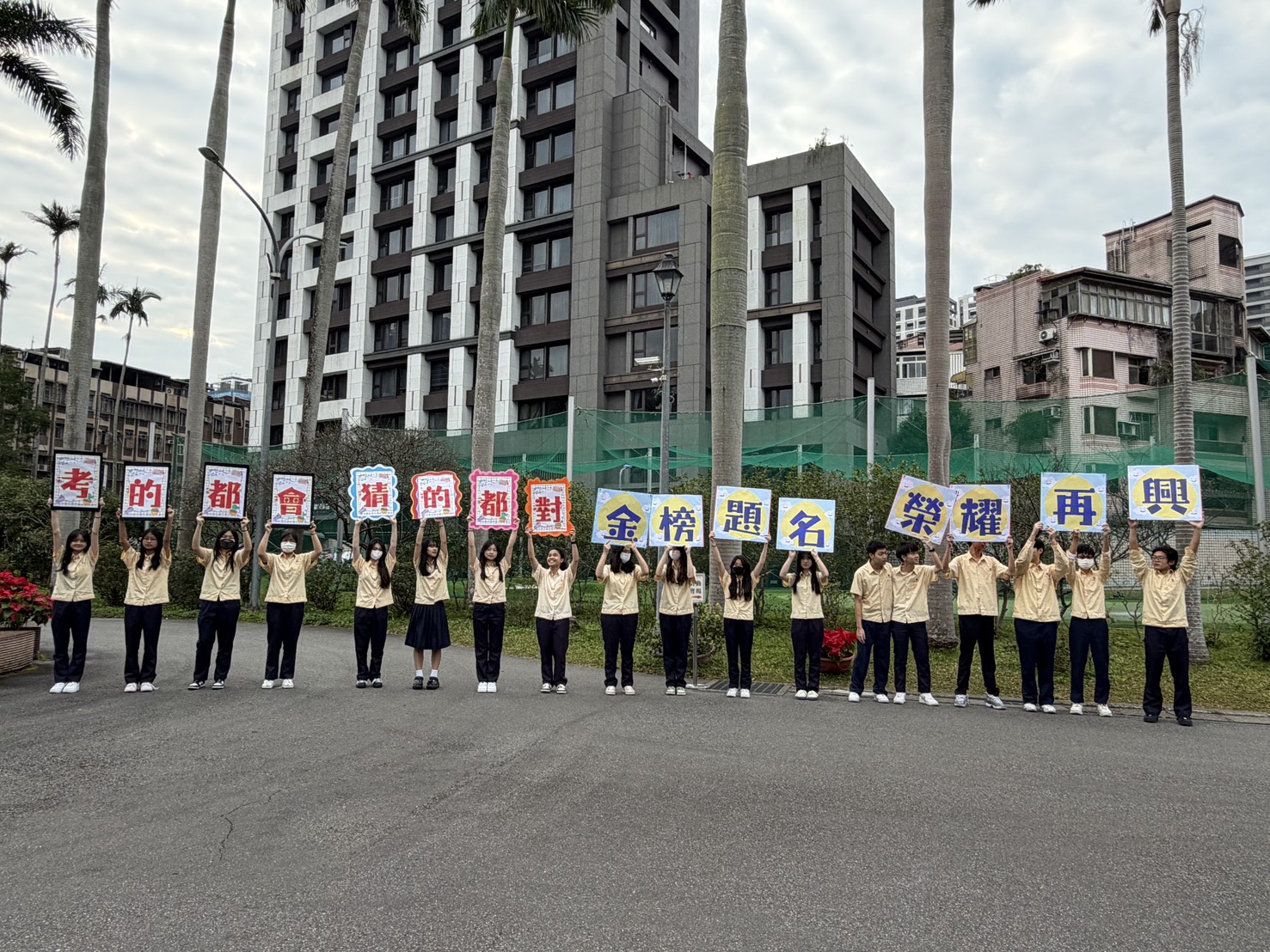 為勉勵今年參與115學年度學科能力測驗的高三考生,再興中學班聯會特別精心製作加油看板,齊聲高喊「考的都會、猜的都對、金榜題名、榮耀再興」等激勵口號,校園內充滿應援熱忱。 在考試出發當日,由張東勇校長親自率領各處室主任、組長及各科老師們,齊聚籃球場,為考生們舉行壯行儀式。師長們溫暖的擁抱與擊掌加油、學弟妹的熱血聲援,不僅減輕了應考的壓力、增強了信心,更凝聚了校園情感。在此預祝每位考生都能發揮實力,在3天的學測中都能有超常發揮,考取心目中理想的學校,也為校爭光!