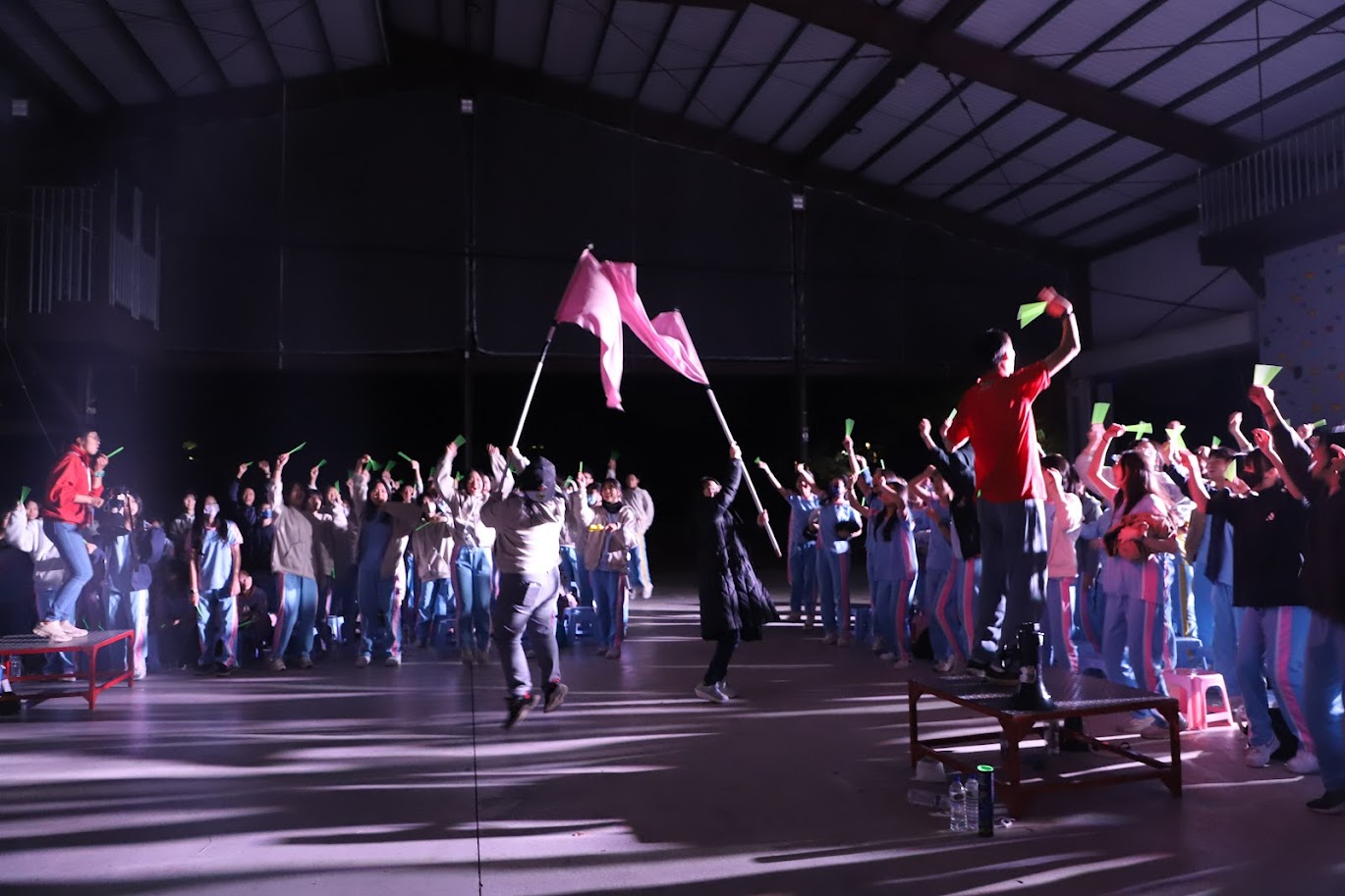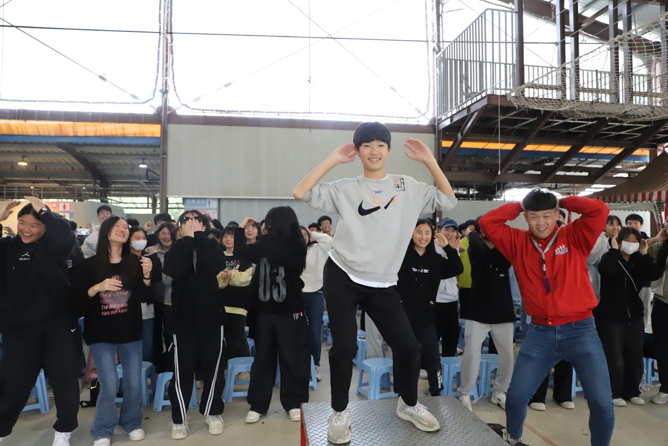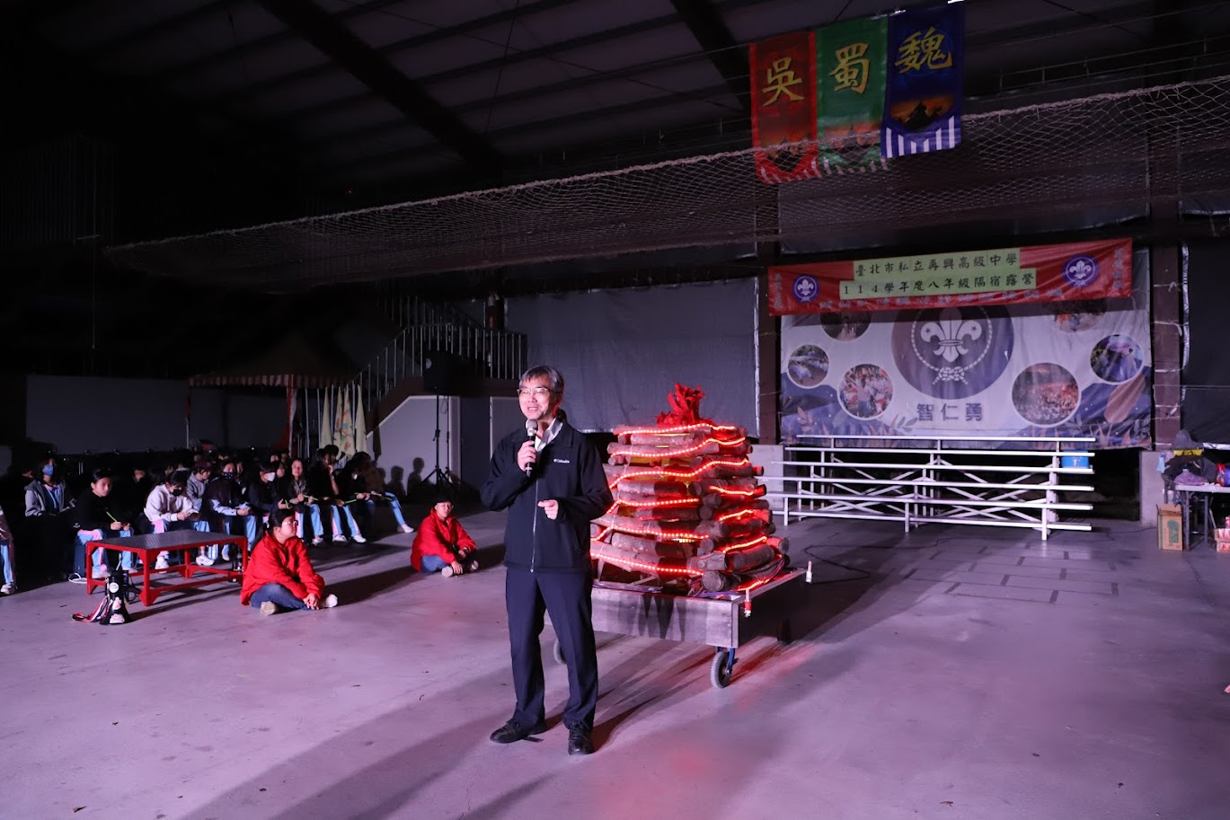 1月29日(四)一早懷抱著雀躍興奮的心情準時7:20集合完畢,張校長叮嚀同學活動期間要遵守各項安全須知,接著各車完成逃生演練後,隨即由向主任帶隊出發。9:30抵達活動地點——新竹小叮噹科學園區,同學們個個精神抖擻,隊伍排列不論站或坐都是整齊劃一,呼喊口號更是嘹亮有勁,完全展露出青春活力。10:30舉行開訓典禮後,第一項挑戰就是營地建設,夜寢小隊合力搭建帳棚 ,爲夜宿野外做好準備;下午的分站教育訓練,活動小隊在勁歌熱舞、急中生字ㄅㄆㄇ、羅馬砲、七彩霓虹四項關卡中發揮團結合作、協力破關,展現班級向心力;晚上的野炊活動,同學們便挽起袖子,洗菜、切菜、烹調,將食材化為一道道佳餚。活動進行間,老師們紛紛親自示範指導同學如何料理美食,同學們驚喜歡呼連連,讓整個野外晚炊充滿溫馨歡樂。營火晚會將活動帶到了最高潮。由向主任領軍帶領老師們進場,接著由各班代表以勇士舞揭開晚會序幕,向主任點燃營火後,宣布晚會活動正式開始。師生三百多人圍著營火熱力四射的歡呼舞動,隨著營火舞的結束的同時,此時神秘嘉賓----張校長在公務繁忙之餘,親臨會場為全體師生鼓舞打氣一起同歡,也將晚會的氣氛拉到最高峰;在晚會的尾聲,同學們以感恩的心向在臺北的家人、現場的老師們以及一起共同參與的同學們相互致謝。晚會後,男女同學們分開前往盥洗及吃宵夜,所有同學於晚上10:00準時進入帳棚內就寢,而老師們也分別前往營帳間探視,叮嚀同學們注意夜晚保暖,師生互道晚安,結束了一天精彩的活動。