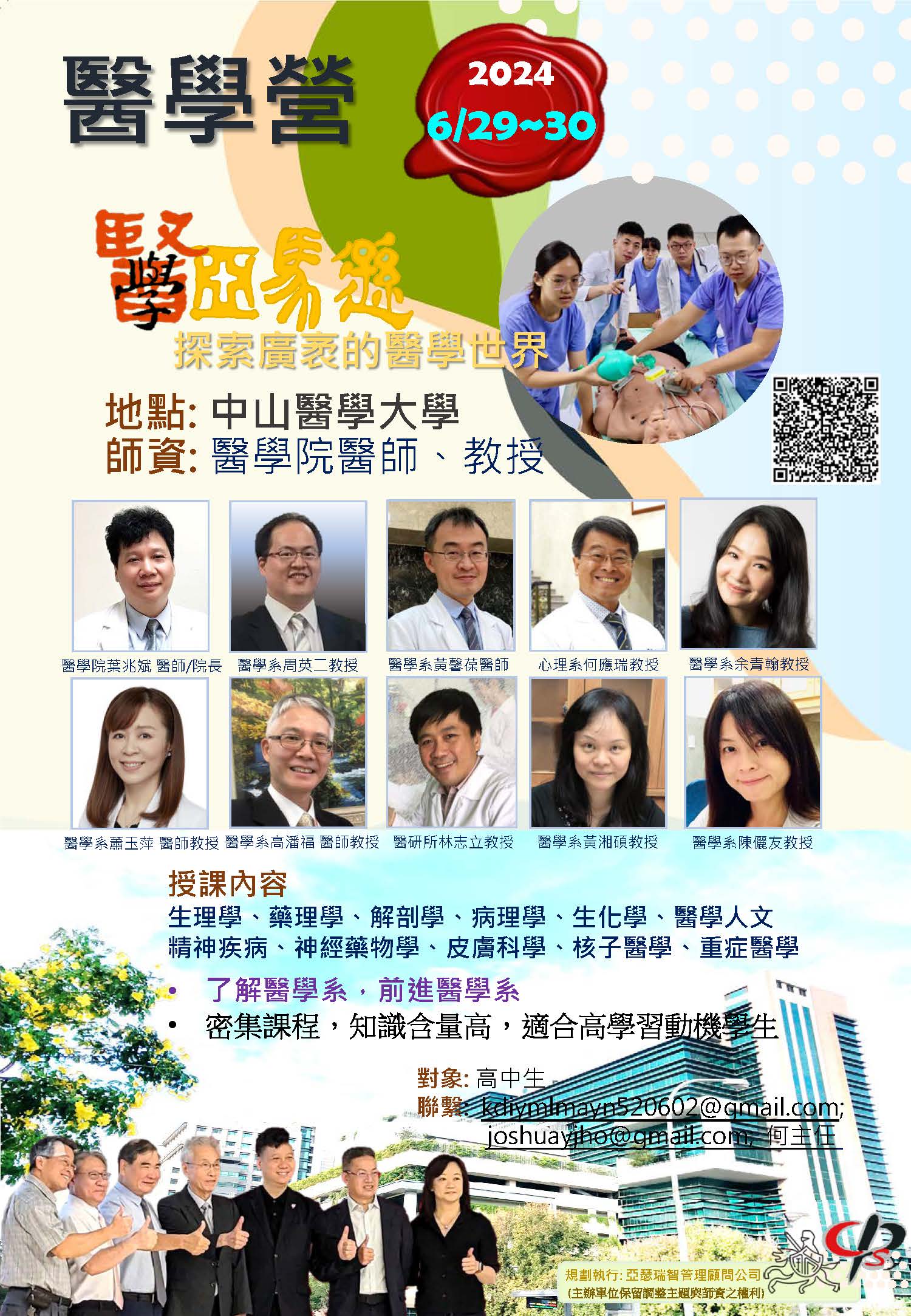 一、為豐富高中生自學探索與學涯規畫之需要,本校特邀請優 秀師資,規劃專屬於醫學領域之營隊課程。
