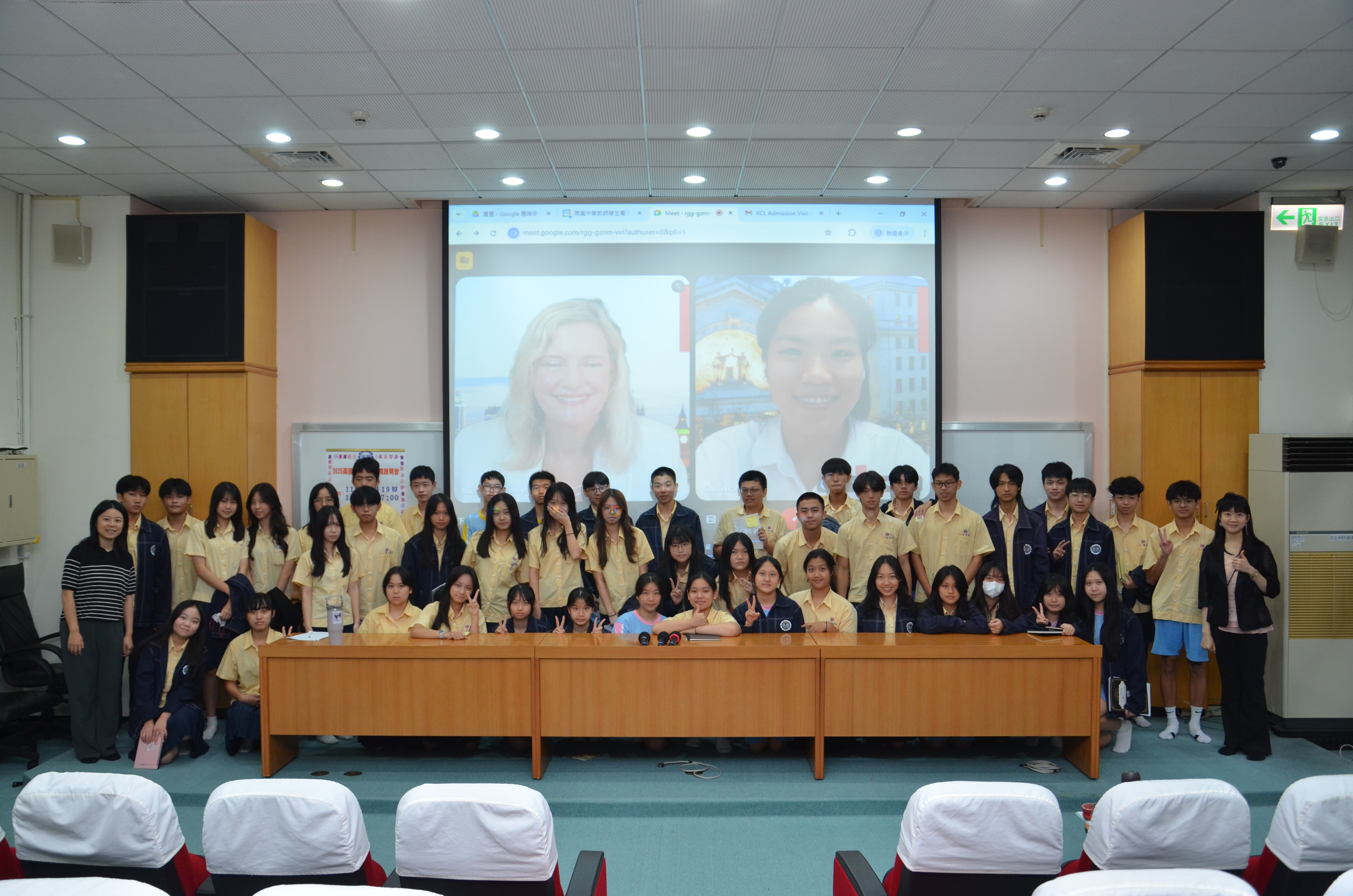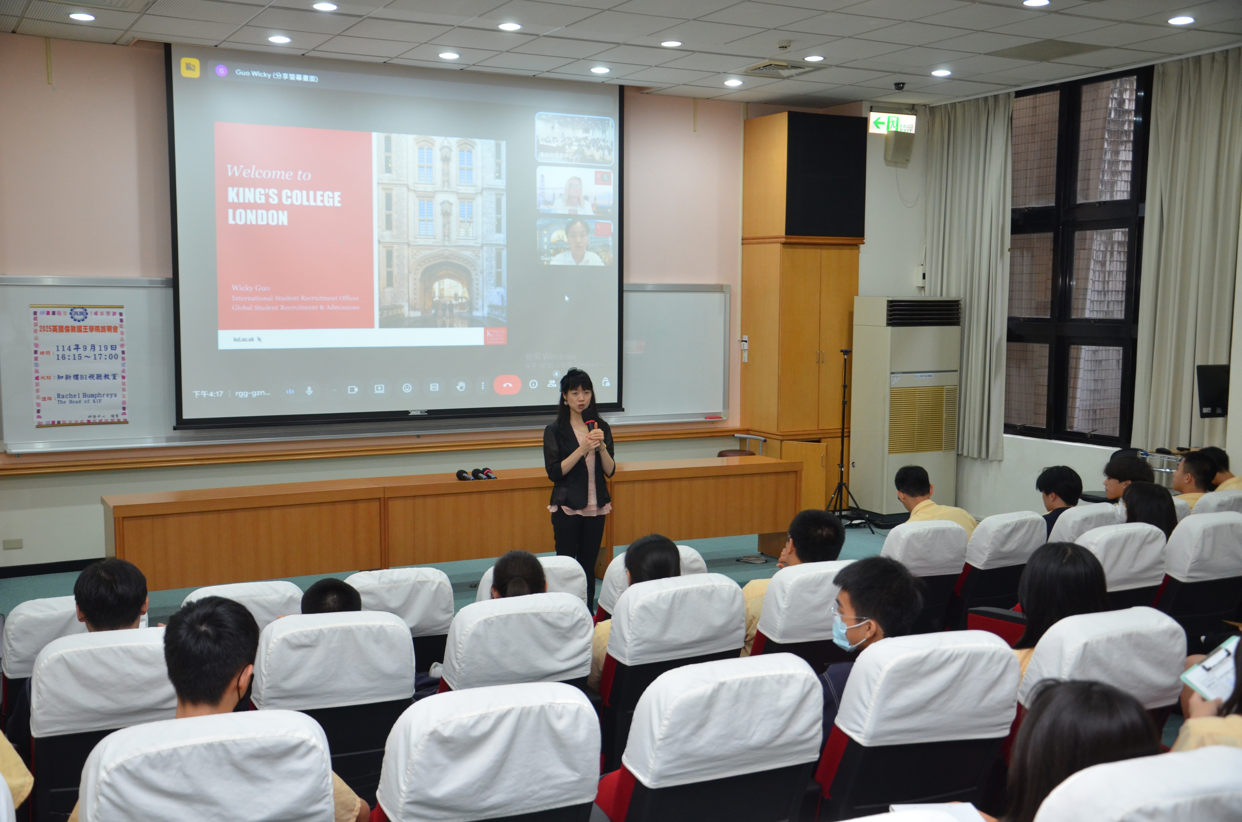 本校9月19日舉辦英國倫敦國王學院說明會,邀請國際升學部主任Rachel Humphreys 與招生專員Wicky Guo,一同介紹校園與申請流程。本場說明會共有45位高中部學生參加,內容分為五個部分:學校基本資訊、國際預科課程介紹、入學條件與申請時程、學校生活,以及學生提問時間。