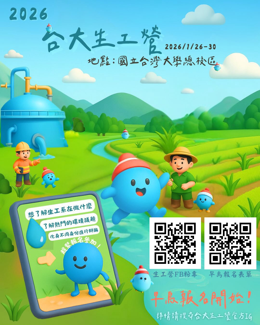 台灣大學舉辦「2026台大生工營」 【說明】: 一、 營隊活動主題:「2026台大生工營」。 二、 營隊活動時間:115年1月26日(星期一)至 115年1月30日(星期五),共5天4夜。 三、 營隊活動地點:本校公館校總區。 四、 報名時間:即日起至114年10月31日(星期五)。 五、 報名方式:採網路報名,完成表格填寫及完成匯款。 六、 費用:原價每人新臺幣7,300元整, 早鳥團體報名每人新臺幣6,400元整, 早鳥優惠價新臺幣6,700元整。 七、 活動訊息網站:臉書搜尋「2026台大生工營」。