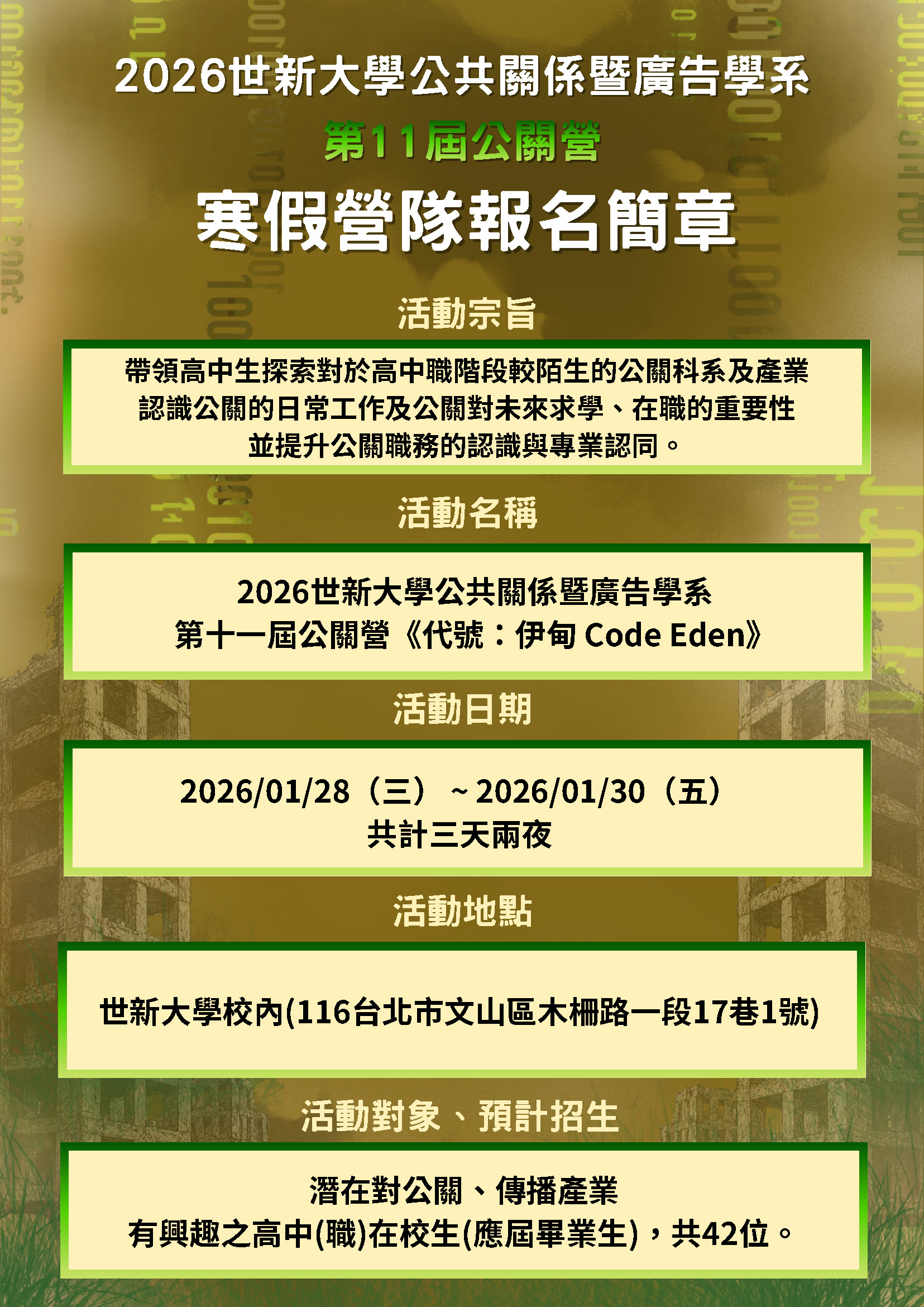 說明: 一、本校以傳播專業聞名,而公共關係暨廣告學系相較其它大學的廣告相關科系,除了有廣告專業訓練外,更融合了紮實的公共關係課程,如公關策展、議題製造、危機處理、企業公關、公關稿寫作與報導等課程。此次活動主要是期望透過活潑的營隊方式,將公共關係的概念與精神傳遞予即將進入大學的高中(職)學生,可先探索公關產業相關知識外,也體驗世新大學公共關係暨廣告學系學生多采多姿的大學生活。 二、活動時間:115年1月28日(三)至1月30日(五) 三、活動對象:全國高中(職)在學學生,總計42名。 四、活動地點:世新大學 五、報名時間及收費方式: (一)早鳥方案報名時間:114年11月7日至114年11月14日(限量12名)。單人4,600元,兩人同行8,800元。 (二)一般方案報名時間:114年11月21日至114年12月12日。單人4,900元,兩人同行9,400元。 六、活動FB粉絲專頁「世新大學公關營」、官方IG「@pr.codeden2026」。 世新大學「第十一屆公關營《代號:伊甸 CodeEden》」活動