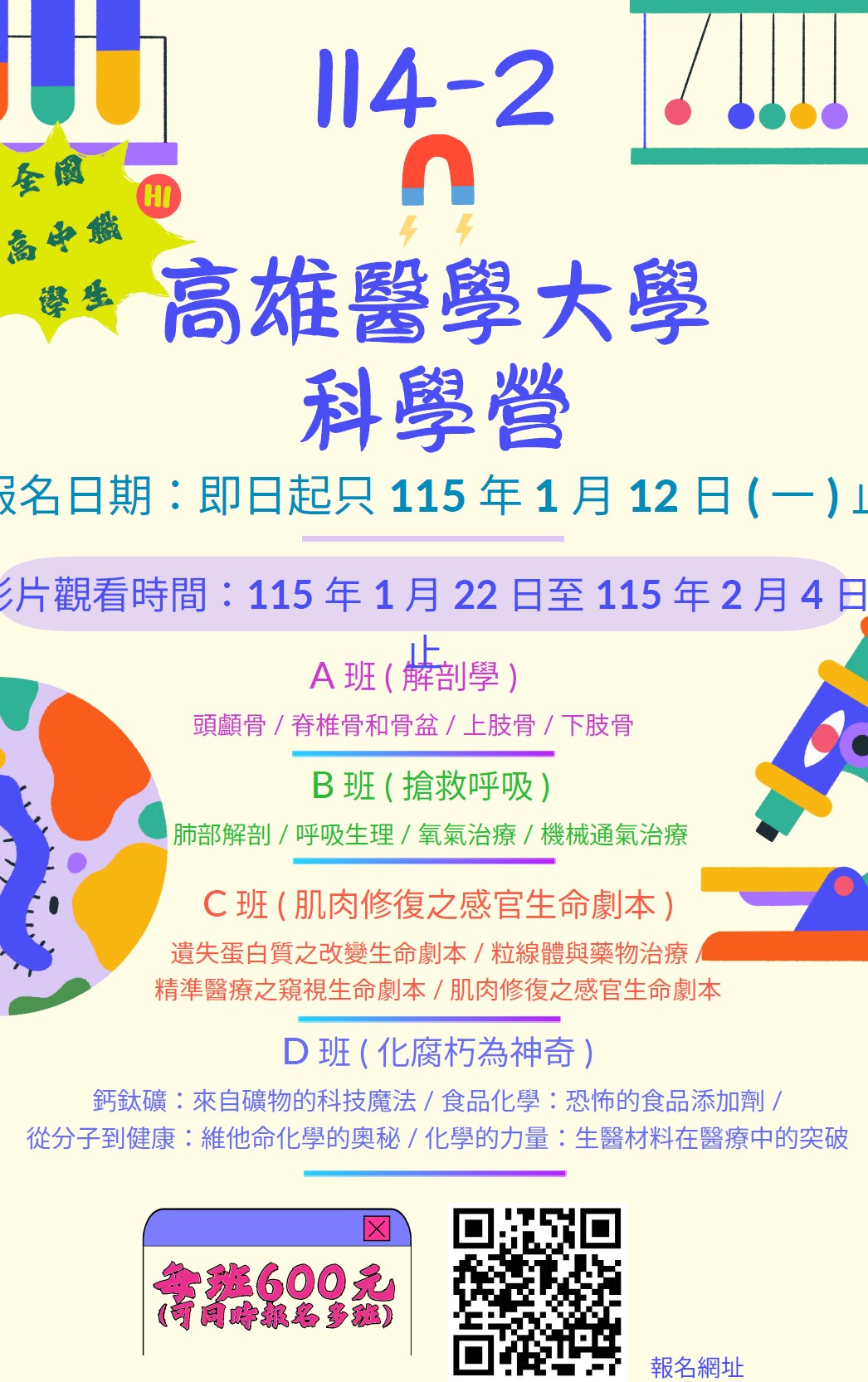 高雄醫學大學「114-2高醫科學營」線上課程說明: 本校教務處訂於115年1月22日(星期四)起辦理「114-2高醫科學營」線上課程,旨在協助高中職學生認識醫學相關知識及本校特色,敬請貴校協助公告並轉知所屬學生踴躍報名參加。 一、課程期間:115年1月22日(四)起到115年2月4日(三)止。 二、上課方式:線上課程。 三、招生對象:對本課程有興趣之高中職學生。 四、報名期間:即日起至115年1月12日(一)止。 五、課程內容與費用: (一)A班【解剖學】:學系介紹、頭顱骨、脊椎骨與骨盆、上肢骨、下肢骨。 (二)B班【搶救呼吸】:學系介紹、肺部解剖、呼吸生理、氧氣治療、機械通氣治療。 (三)C班【生命的演員-改變生命之劇本】:學系介紹、遺失蛋白質之改變生命劇本、粒線體與藥物治療、精準醫療之窺視生命劇本、肌肉修復之感官生命劇本。 (四)D班【化腐朽為神奇】:學系介紹、鈣鈦礦-來自礦物的科技魔法、食品化學-恐怖的食品添加劑、從分子到健康-維他命化學的奧秘、化學的力量-生醫材料在醫療中的突破。 (五)每班報名費用為新臺幣600元,學生可自由選擇報名一班或多班。 六、線上報名網址:https://dce.kmu.edu.tw/edu/edum000.php?_CD_CTP=TEE,並請詳閱相關規定。 |