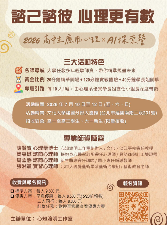 ✨ 2026 高中生應用心理 X AI 探索營 ✨「心知渡明工作室」2026 高中生應用心理 X AI 探索營