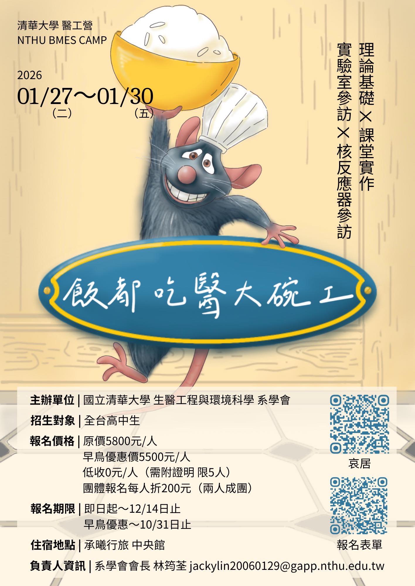 【營隊詳情】 不論您是希望把握機會參與第一屆醫工營的同學,或對醫療科技與工程創新 充滿好奇、渴望體驗跨領域合作的新朋友,清大醫工營 全體團隊誠摯期待與您一同啟程,探索醫學與工程的無限可能! 理論基礎X課堂實作X實驗室參訪X核反應器參訪 主辦單位|國立清華大學醫環系 招生對象|全台高中生 報名時間|即日起~ 2025/12/14 (日) 早鳥優惠|即日起~ 2025/10/31 (五) 活動時間|2026/01/27 (二) ~ 2026/01/30 (五) 報名費用 -原價 5800/人 -早鳥優惠價 5500/人 -團報價 每人折抵200 (兩人成團) -符合低收身份 3000/人 (請檢附證明 限5人) 負責人|林筠荃 jackylin20060129@gmail.com 聲明與注意事項 1.本營隊所蒐集之所有資料(包括個人基本資訊、聯絡方式、報名表單及相關文件),僅供本營隊活動規劃、投保保險與聯絡之用。 2.所有資訊將嚴格保密,不會提供予營隊以外之任何第三方,也不會用於與活動無關之其他用途。 3.為確保您已完成報名程序,請於填寫表單後前往電子信箱確認是否收到「報名成功通知」。若未於24小時內收到通知,請主動與本營隊聯繫,以保障您的報名權益。 4.務必於「規定期限內匯款至指定指定帳戶」才算完成報名,如超過時限仍未匯款則視為報名無效。 5.核反應器參訪為參觀本校「THOR水池式反應器」,該反應器目前於「硼中子捕獲治療」貢獻顯著,並且專攻於無法利用常規療法治療之癌症。本次參訪會於停機狀態且符合相關安全規範下參觀,請參加學員無需擔心。(參考更多資料) 6.如已經繳費完成,但無法參加者將依照下方規定返還部分報名費 - 12/14 前 全數退還 - 12/31 前 退還80%金額 - 12/31 後 皆不退費 2026清華大學醫工營《飯都吃醫大碗工》