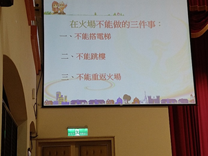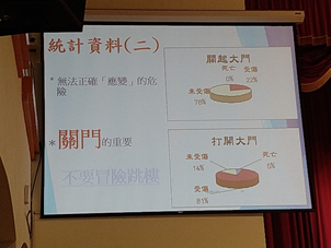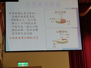 講師先以三點常見的錯誤迷思—1.火災時,要躲進浴室避難? 浴室及廁所並非是好的待救地點,因為塑膠材質的門板一遇高溫就會融化,是火場中的致命陷阱。2.向下逃生有困難時,知道要向上逃生? 水平避難優先於向上避難,因為煙囪效應會導致火場快速發展不易逃生。人往上跑的速度絕對不會比濃煙快,所以往上反而越危險,會暴露在濃煙中。3.一發生火災趕緊跑出門外?當門外已高溫有濃煙時,應立即關門並塞住門縫,防止煙流進入,於陽台或窗戶之明顯位置待救。