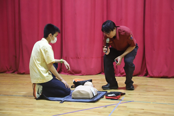 講師提醒同學們,安全是自己的責任,火災瞬息萬變,平時要有危機意識,多瞭解消防安全常識及逃生避難方法。避免在室內堆放過多雜物影響逃生、電器產品周邊不放置可燃物、電線不綑綁、使用延長線不超載、不潮濕汙損擦頭。進入陌生場所時,應留意安全門、梯位置,熟悉逃生路徑,並注意有無兩個不同逃生方向出口。認識平時居住環境或辦公處所之消防設施及逃生避難設備,事前準備好防災包,擬妥逃生避難計畫並預習,狀況發生時,便能從容應付,順利逃生。最後,講師邀請同學上台示範CPR與AED的操作步驟,平時多一分演練,緊急時就能搶救一個寶貴的生命。