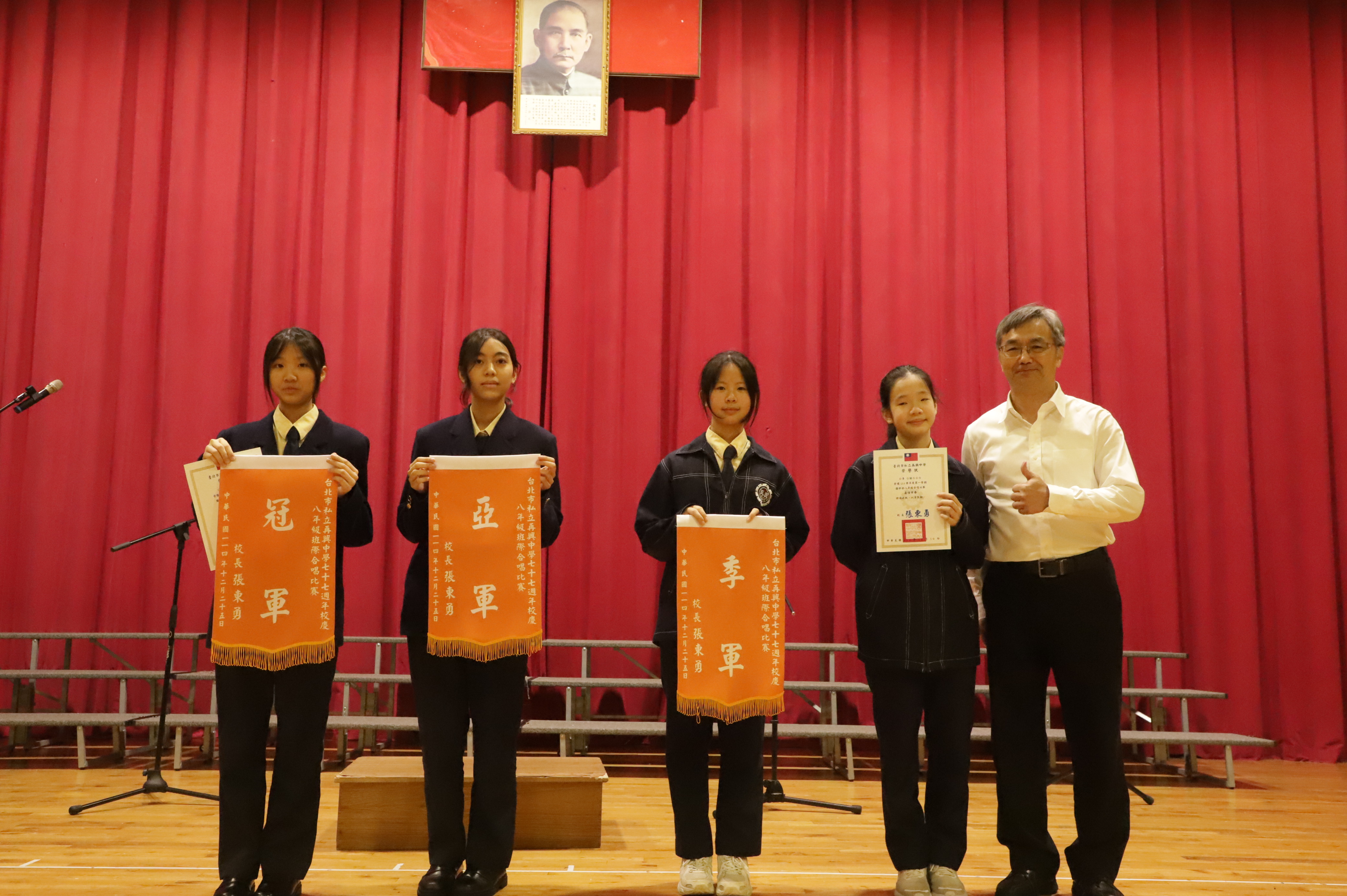 校長在致詞與公布比賽結果後,親自頒發錦旗給得獎班級。本次合唱比賽不僅是展現各班音樂實力的舞台,更是一次凝聚班級向心力與展現團隊精神的機會,恭喜所有獲獎班級與同學,也感謝所有參賽者,帶來一場精彩絕倫的音樂饗宴。